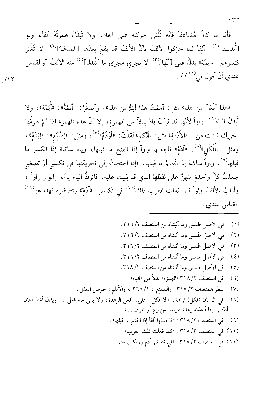 «هذا أفعل من هذا» مثل: أممت هذا أيم من هذا، وأصغر: "أيمة" "أيمة" ولا أبدل الياء واواً لأنها قد ثبتت ياء بدلا من الهمزة، إلا أن هذه الهمزة إذا لم طرفها تحريك فبنيت من: "الأدمة" مثل: "أبكم" لقلت: "أودم" ومثل: "إصبع": "إيدم"، ومثل: "أفكل": "آدم" فاجعلها واواً إذا انفتح ما قبلها، وياء ساكنة إذا انكسر ما قبلها، واواً ساكنة إذا انضم ما قبلها، فإذا احتجت إلى تحريكها في تكسير أو تصغير جعلت كل واحدة منهن على لفظها الذي قد بنيت عليه، فاترك الياء ياء، والواو واواً، وأقلب الألف واواً كما فعلت العرب ذلك في تكسير: "آدم" وتصغيره فهذا هو القياس عندي