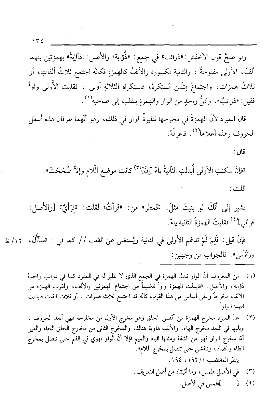 ولو صح قول الأخفش: "ذوائب" في جمع: "ذؤابة" والأصل: "ذأابة" بهمزتين بنهما ألف، الأولى مفتوحة، والثانية مكسورة والألف كالهمزة فكأنه اجتمع ثلاث ألفاتن أو ثلاث همزات، واجتماع مثلين مستكره، فاستكراه الثلاثة أولى، فقلبت الأولى واواً فقيل: "ذوائب" وكل واحد من الواو والهمزة ينقلب إلى صاحبه.