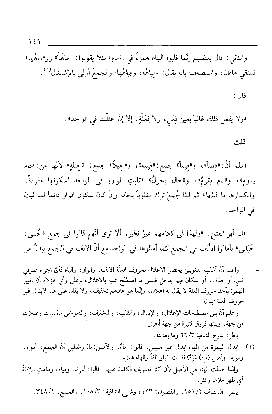 اعلم أن: "ديما"، و"قيماً" جمع "قيمة"، و"حيلا" جمع: "حيلة" لأنها من: "دام يدون" و"قام يقوم" و"حال يحول" فقلبت الواوو في الواحد لسكونها مفردة، وانكسارها ما قبلها، ثم لما جمع ترك مقلوباً بحاله وإن كان سكونا الواو دائما لما ثبت في الواحد.