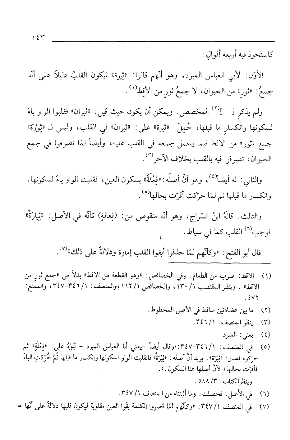 الأول: لأبي العباس المبرد، وهو أنهم قالوا: "ثيرة" ليكون القلب دليلا على أنه جمع: "ثور" من الحيوان، لا جمع ثور من الأقط.