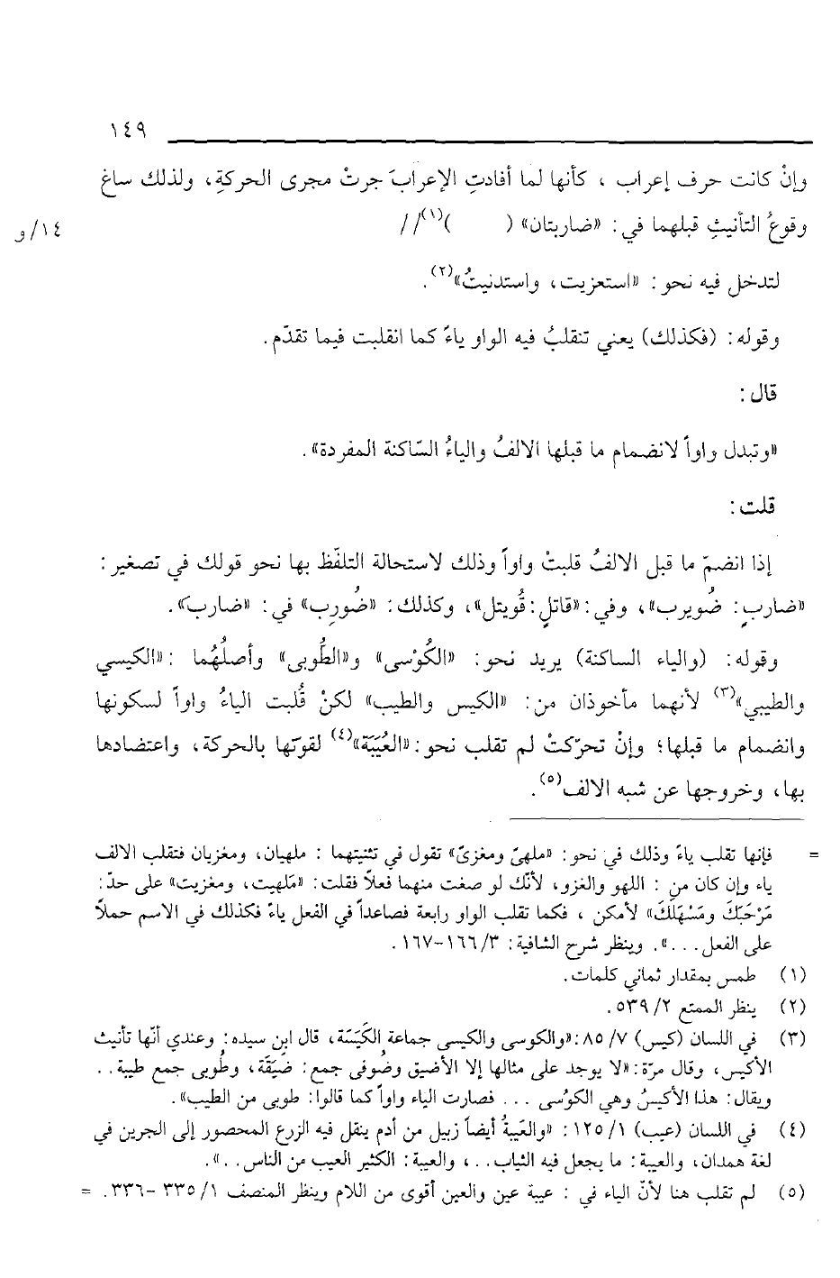 وقوله: (والياء الساكنة) يريد نحو: "الكوسي" و"الطوبي" وأصلهما: "الكيسي والطيبي" لأنهما مأخوذان من: "الكيس والطيب" لكن قبلت الياء واواً لسكونها وانضمام ما قبلها، وإن تحركت لم تقلب نحو: "العيبة: لقوتها بالحركة، واعتضادها بها، وخروجها عن شبه الألف.