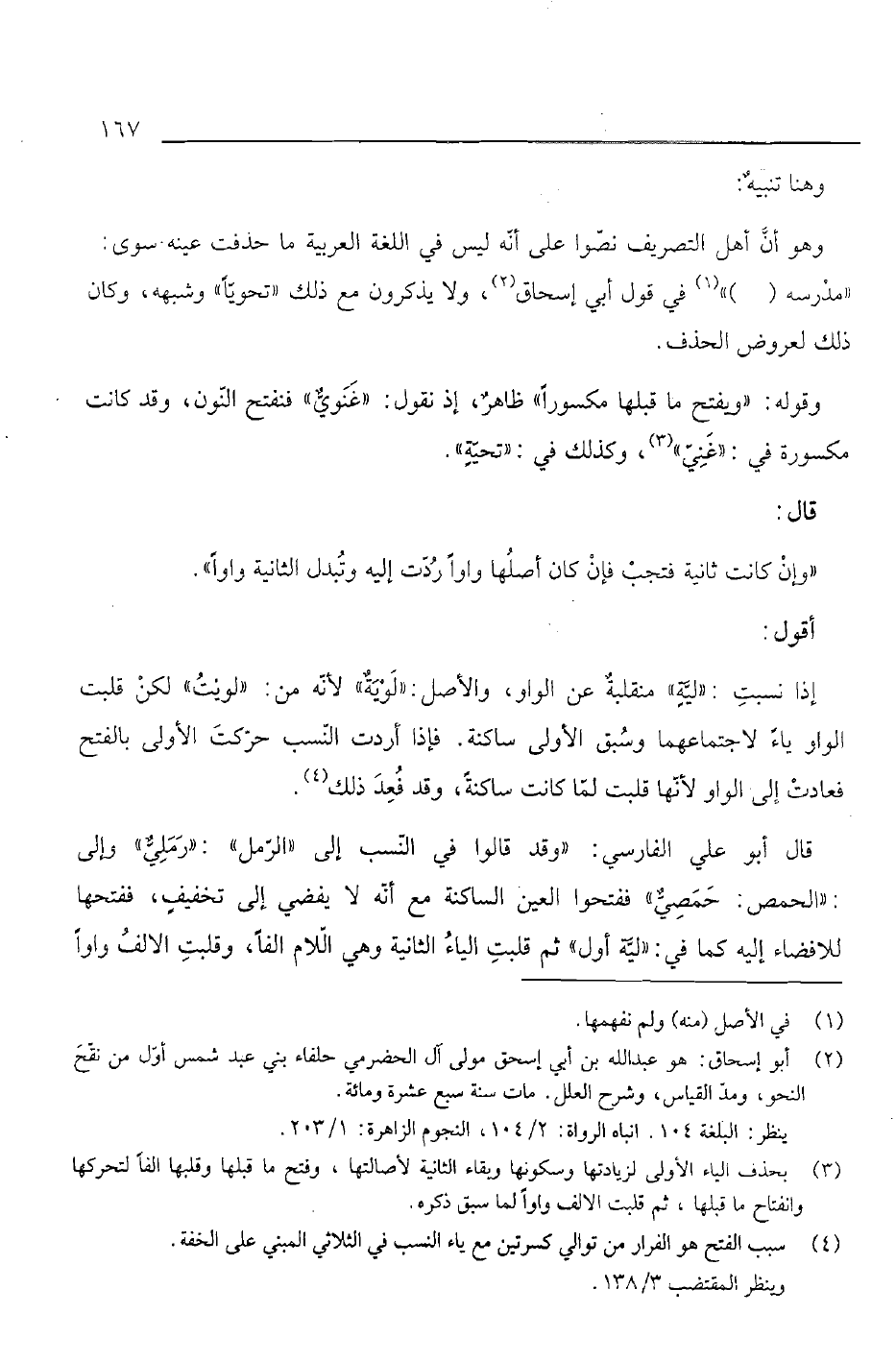 قال أبو علي الفارسي: «وقد قالوا في النسب إلى "الرمل"رملي وإلى: "الحمص: " حمصي" ففتحوا العين الساكنة مع أنه لا يفضي إلى تخفيف، ففتحها للإفضاء إليه كما في"لية أول" قم قلبت الياء الثانية وهي اللام ألفا، وقلبت الألف واواً