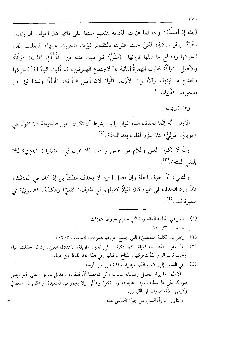 والثاني: " أن حرف العلة وأن فصل العين لا يحذف مطلقاُ بل إذا كان في المؤنث، فإن ورد الحذف في غيره كان قليلا كقولهم في "ثقيف: ثقفي" وعكسه: "عميري" في عميرة كلب.