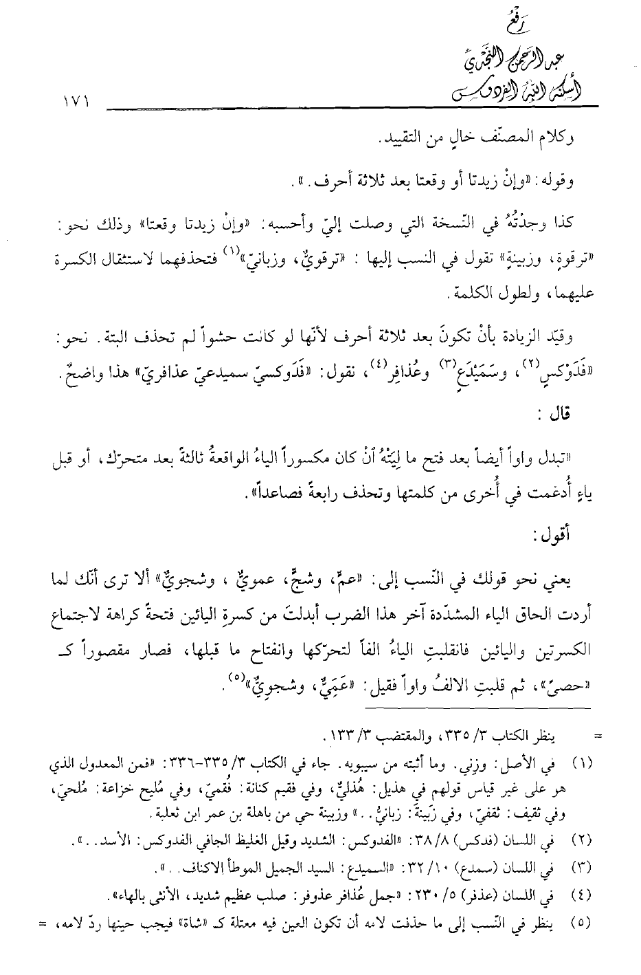 وقيد الزيادة بأن تكون بعد ثلاثة أحرف لأنها لو كانت حشوا لم تحذف البتة. نحو: "فدوكس، وسميدع وعذافر، نقول: "فدوكسي سميدعي عذافري" هذا واضح.