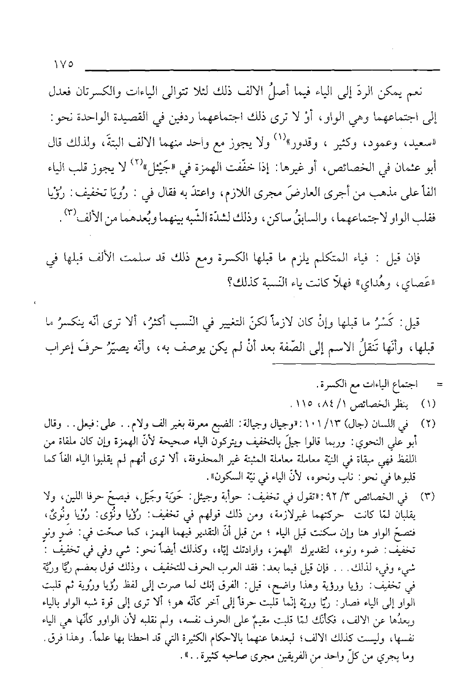 نعم يمكن الرد إلى الياء فيما أصل الألف ذلك لئلا تتوالى الياءات والكسرتان فعدل إلى اجتماعهما وهي الواو، أو لا ترى ذلك اجتماعهما ردفين في القصيدة الواحدة نحو: "سعيد، وعمود، وكثير، وقدور" ولا يجوز مع واحد منهما الألف البتة، ولذلك قال أبو عثمان في الخصاص، أو غيرها: إذا خففت الهمزة في "جيئل" لا يجوز قلب الياء ألفا على مذهب من أجرى العارض مجرى اللازم، واعتد به فقال في: رؤيا تخفيف. رؤيا فقلب الواو لاجتماعهما، والسابق ساكن، وذلك لشدة الشبه بينهما وبعدهما من الألف.