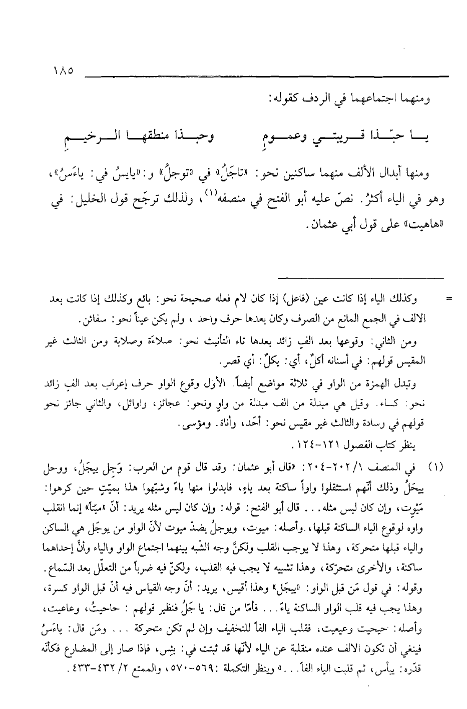 ومنها أبدال الألف منهما ساكنين نحو: "تاجل" في "توجل" و: "يا بس في: ياءس"، وهو في الياء أكثر. نص عليه أبو الفتح في منصفه، ولذلك ترجح قول الخليل: في "هاهيت" على قول أبي عثمان.