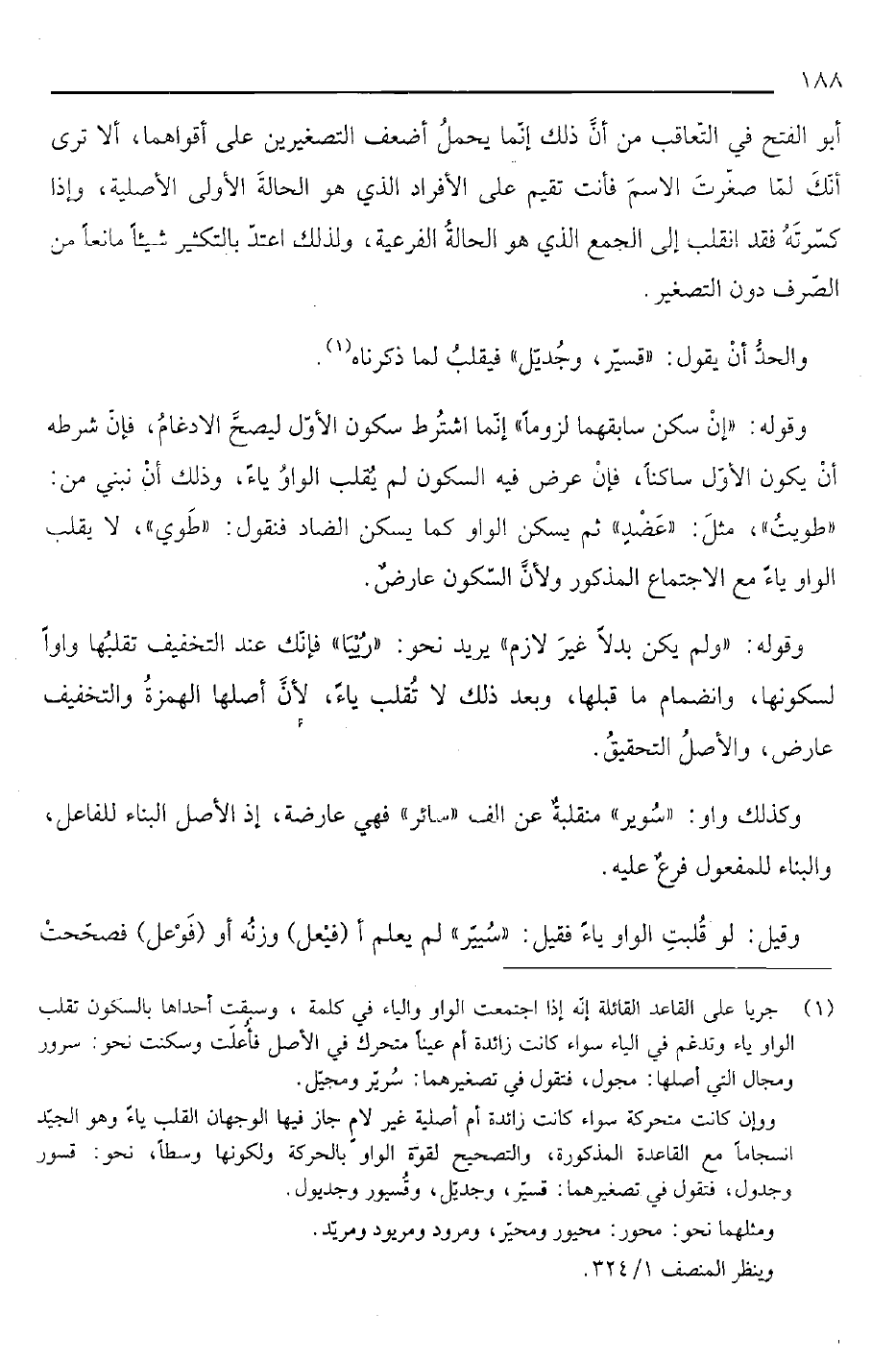 أبو الفتح في التعاقب من أن ذلك إنما يحمل أضعف التصغيرين على أقواهما، ألا ترى أنك لما صغرت الاسم فأنت تقيم على الأفراد الذي هو الحالة الأولى الأصلية، وإذا كسرته فقد انقلب إلى الجمع الذي هو الحالة الفرعية، ولذلك اعتد بالتكثير شيئا مانعاً من الصرف دون التصغير.