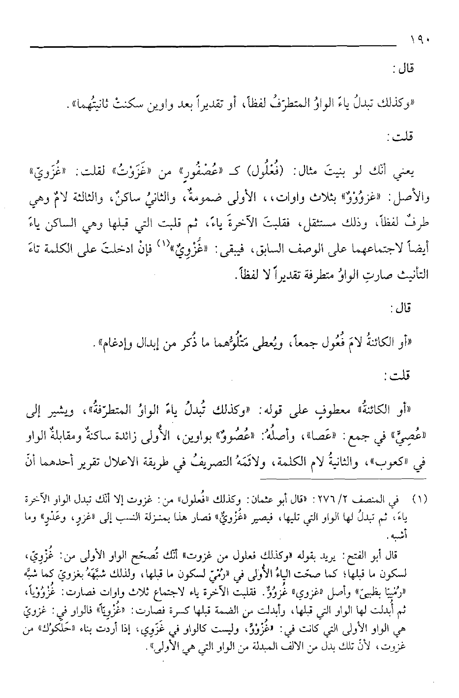 يعني أنك لو بنيت مثال: (فعلول) كـ"عصفور" من"غزوت" لقلت: "غزوي" والأصل: "غزووو" بثلاث واوات، الأولى مضمومة، والثاني ساكن، والثالثة لام وهي طرف لفظاً، وذلك مستثقل فقلبت الآخرة ياء، ثم قلبت التي قبلها وهي الساكن ياء أيضا لاجتماعهما على الوصف السابق، فيبقى: "غزوي" فإن أدخلت على الكلمة تاء التأنيث صارت الواو متطرفة تقديرا لا لفظا.