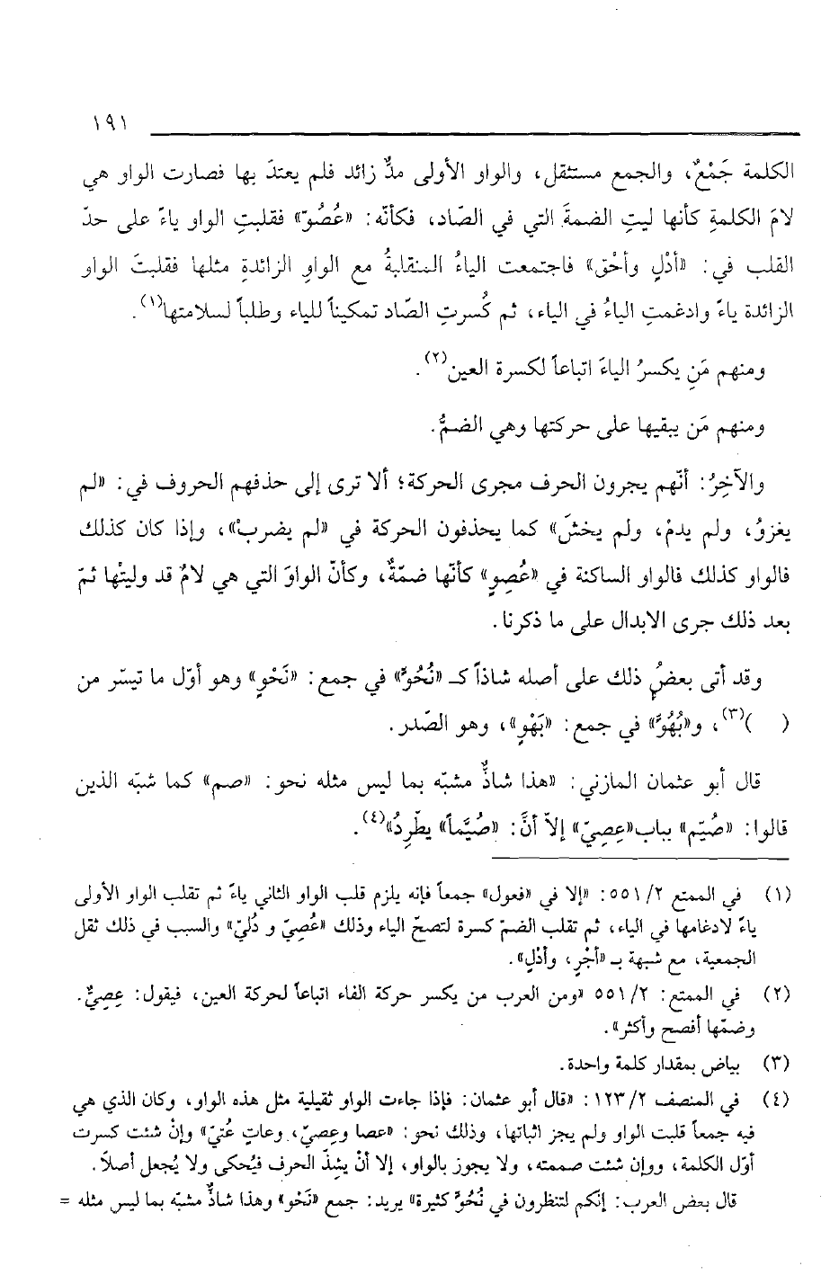 وقد أتي بعض ذلك على أصله شاذا كـ"نحو" في جمع: "نحو" وهو أول ما تيسر من () و"بهو" في جمع "بهو" وهو الصدر.