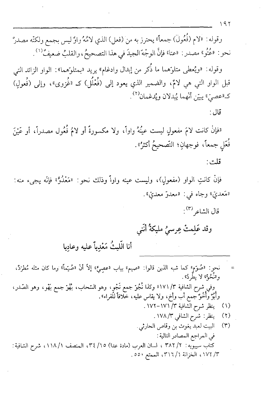 وقوله: "لام (فعول) جمعا" يحترز به من (فعل) الذي لامه واو ليس بجمع ولكنه مصدر نحو: "عتو" مصدر: "عتا" فإن الوجه الجيد في هذا التصحيح، والقلب ضعيف.