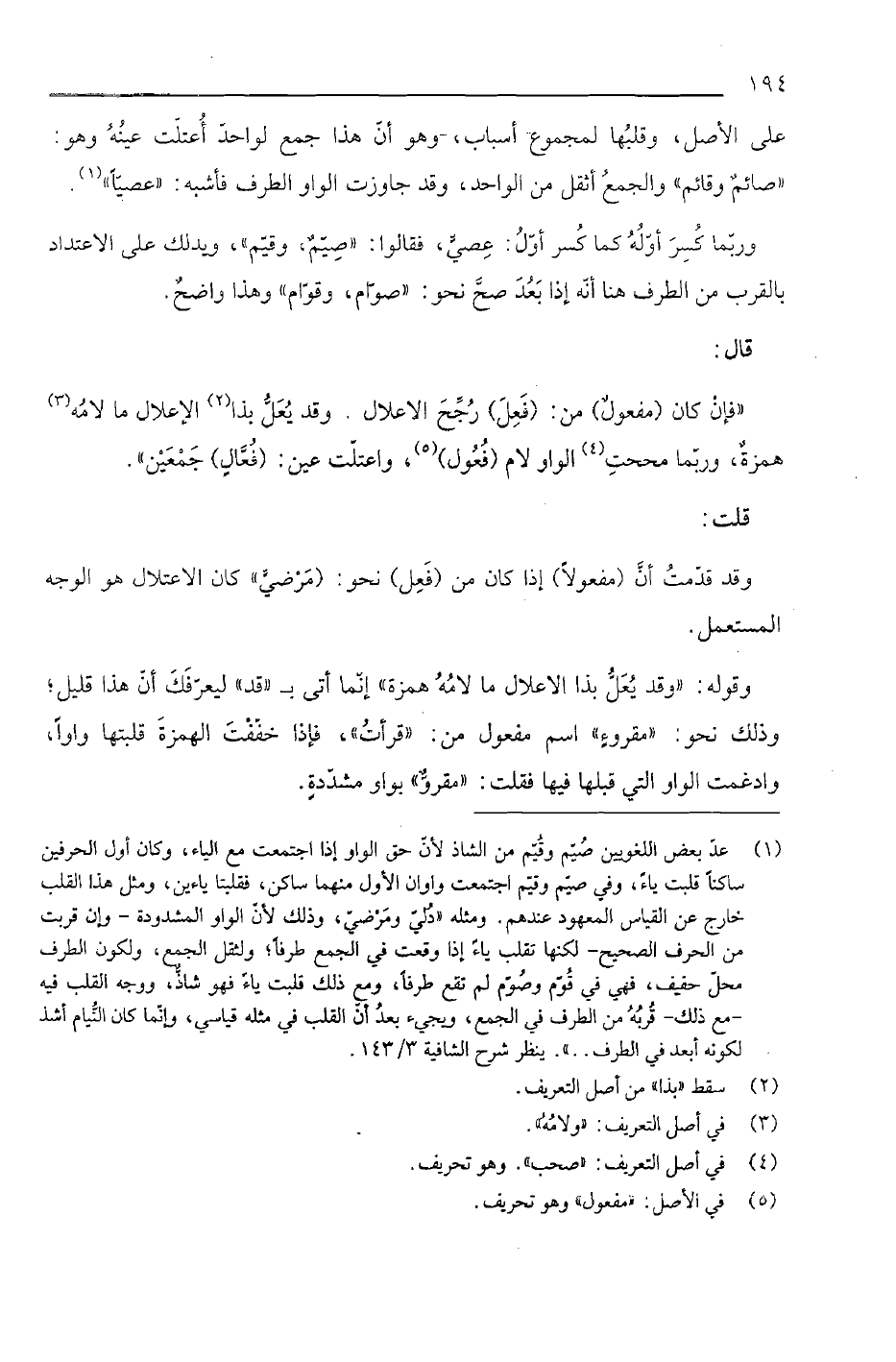 «فإن كان (مفعول) من: " (فعل) رجح الاعلال. وقد يعل بذا الإعلال ما لامه همزة، وربما مححت الواو لام (فعول) واعتلت عين: (فعال) جميعن».