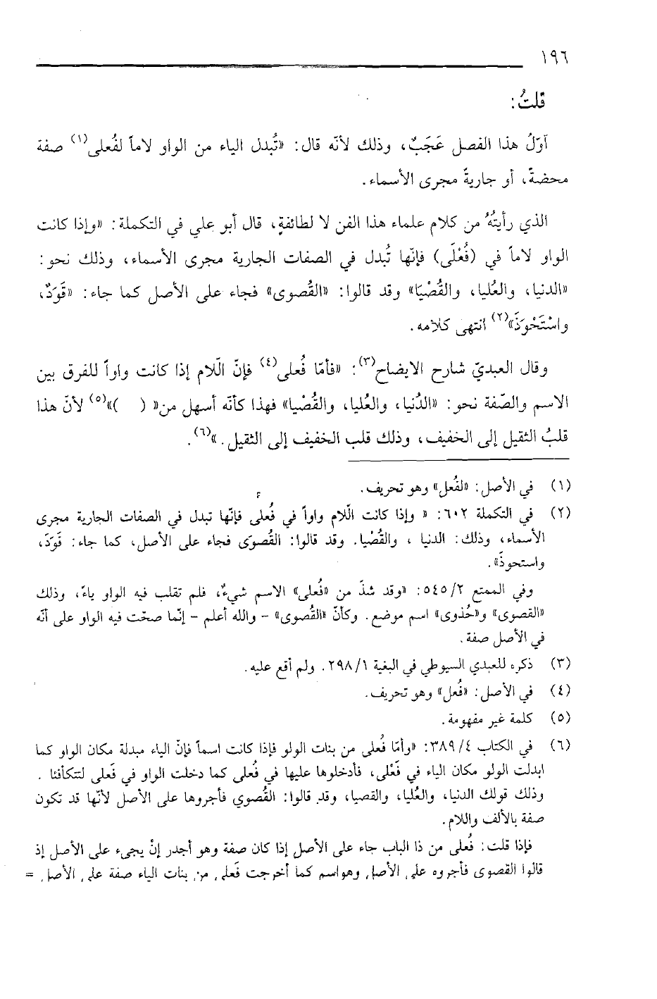 وقال العبدي شارح الإيضاح: «فأما فعلى فإن اللام إذا كانت واواً للفرق بين الاسم والصفة نحو: "الدنيا، والعليا والقصيا" فهذا كأنه أسهل من" () " لأن هذا قلب الثقيل إلى الخفيف /، وذلك قلب الخفيف إلى الثقيل».
