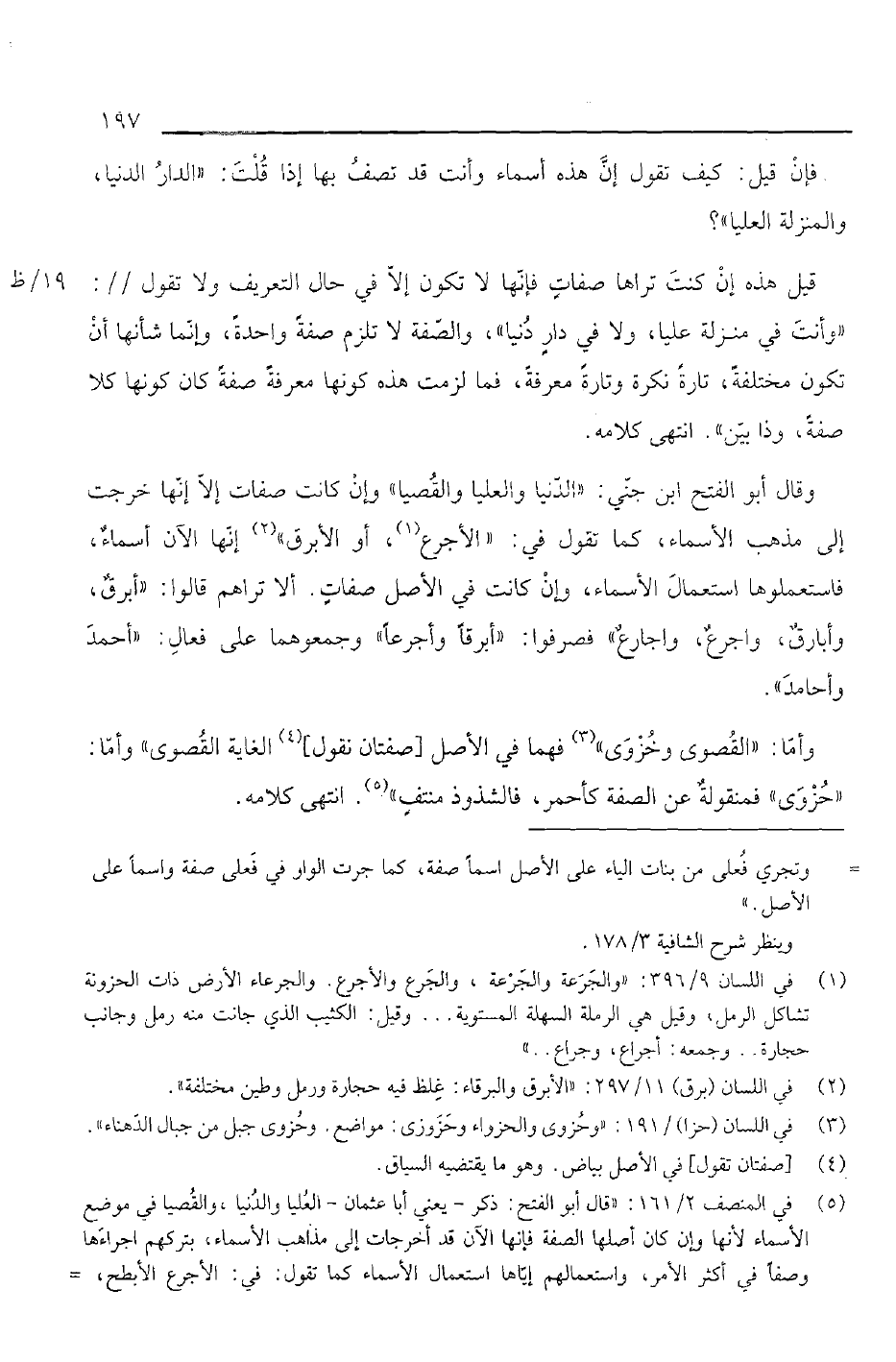 وقال أبو الفتح ابن جني: "الدنيا والعليا والقصيا" وإن كانت صفات إلا إنها خرجت إلى مذهب الأسماء، كما تقول في: "الأجرع، أو الابرق" إنها الآن أسماء، فاستعملوها استعمال الأسماء، وإن كانت في الأصل صفات. ألأا تراهم قالوا: "أبرق، وأبارق، واجرع، واجارع" فصرفوا: "أبرقا وأجرعا" وجمعوهما على فعال: "أحمد وأحامد"