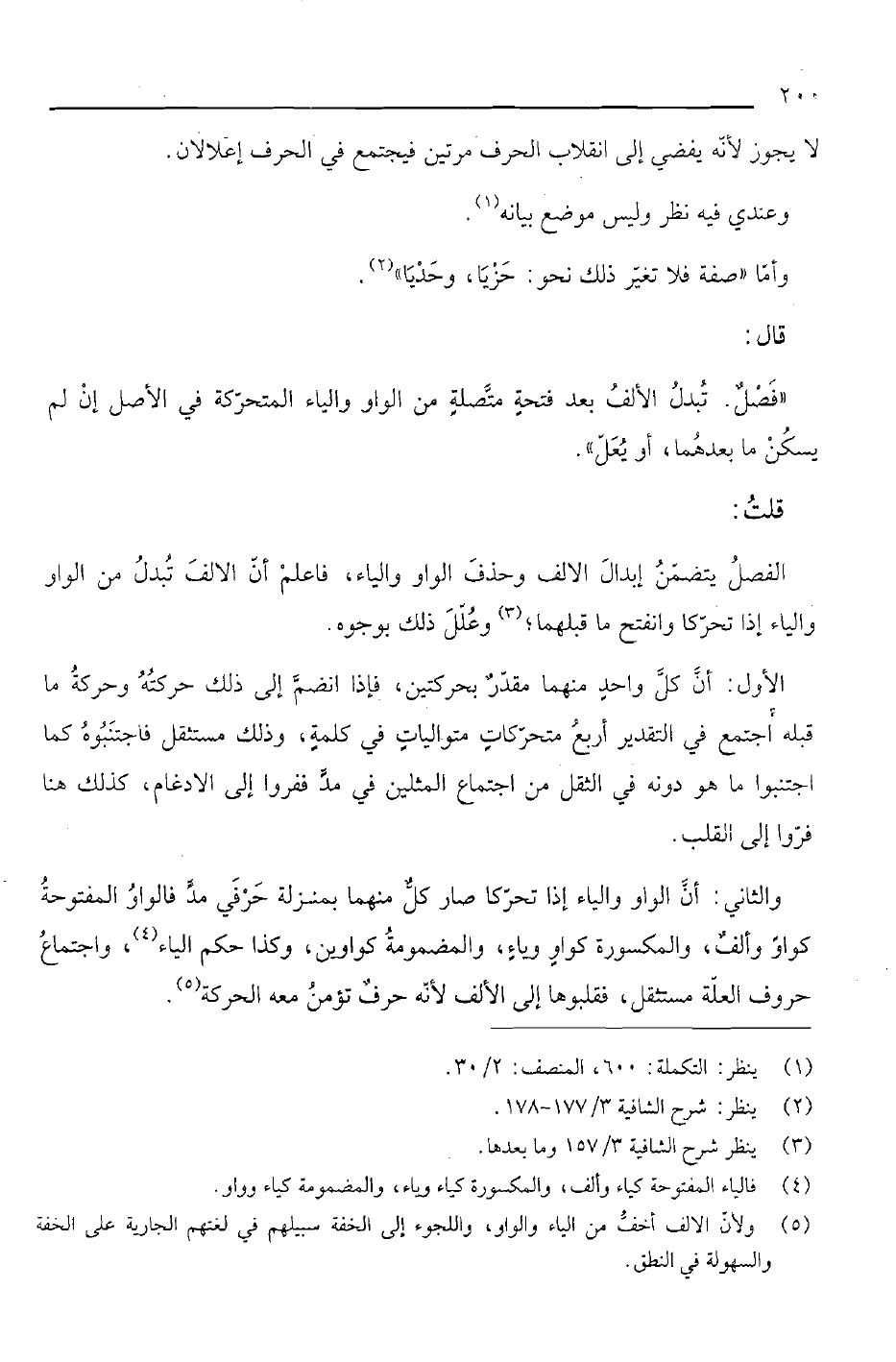 الفصل يتضمن إبدال الألف وحذف الواو والياء، فاعلم أن الألف تبدل من الواو والياء إذا تحركا وانفتح ما قبلهما؛ وعلل ذلك بوجوه.