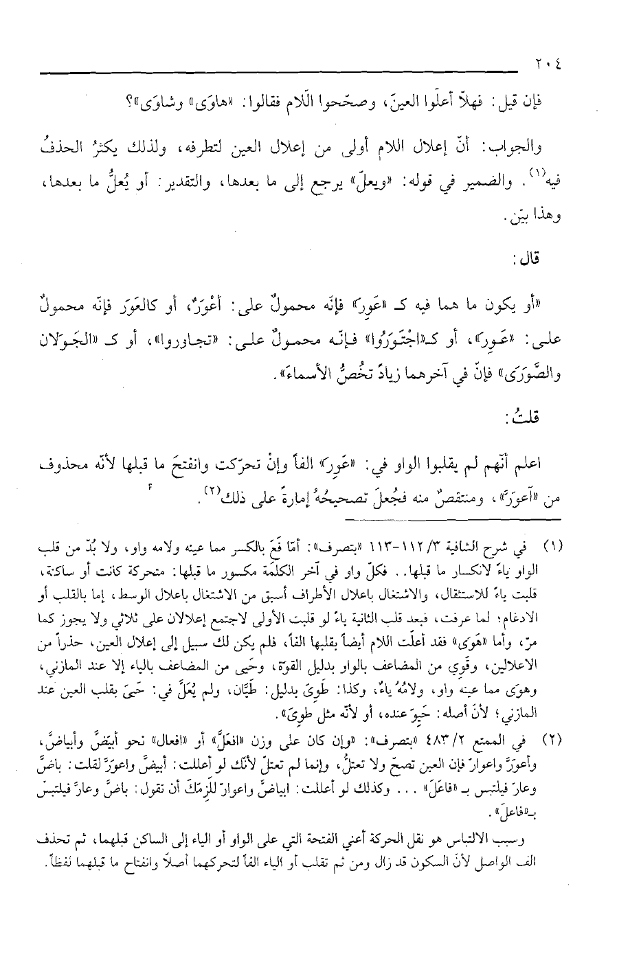 "أو يكون ما هما فيه كـ "عور" فإنه محمولٌ على: أعورٌ، أو كالعور فإنه محمولٌ على: "عور"، أو كـ "اجتوروا" فإنه محمولٌ على: "تجاوروا"، أو كـ "الجولان والصورى" فإن في آخرهما زياد تخص الأسماء".