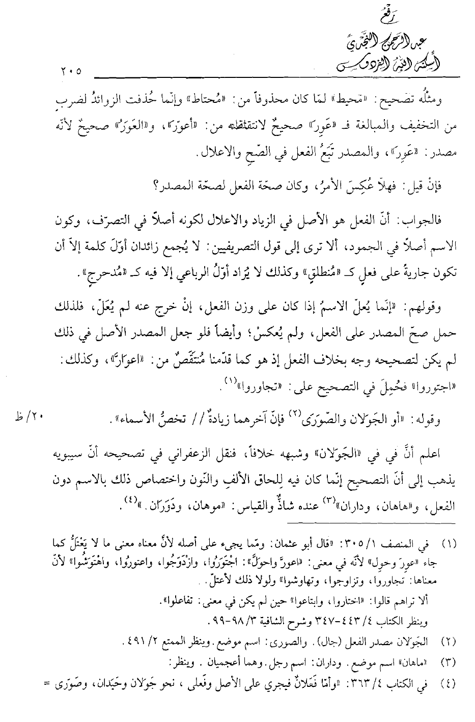 وقولهم: "إنما يعل الاسم إذا كان على وزن الفعل، إن اخرج عنه لم يعل، فلذلك حمل صح المصدر على الفعل، ولم يعكس؛ وأيضاً فلو جعل المصدر الأصل في ذلك لم يكن لتصحيحه وجه بخلاف الفعل إذ هو كما قدمنا منتقصٌ من: "اعوار"، وكذلك: "اجتوروا" فحمل في التصحيح على: "تجاوروا".