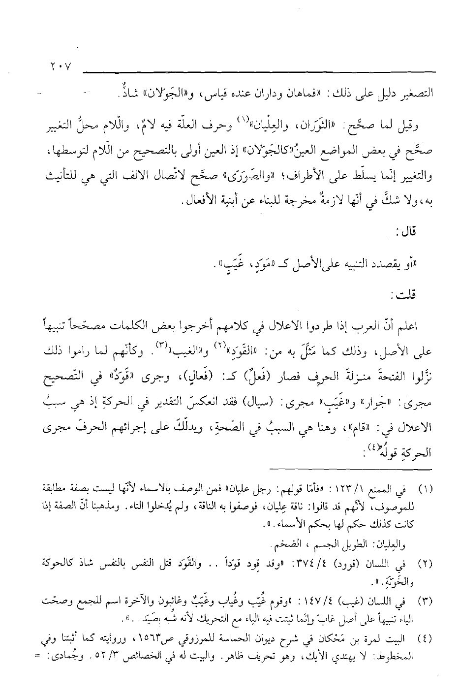 اعلم أن العرب إذا طردوا الاعلال في كلامهم أخرجوا بعض الكلمات مصححاً تنبيهاً على الأصل، وذلك كما مثل به من: "القود" و"الغيب". وكأنهم لما راموا ذلك نزلوا الفتحة منزلة الحرف فصار (فعلٌ) كـ: (فعالٍ)، وجرى "قود" في التصحيح مجرى: "جوار" و"غيب" مجرى: (سيال) فقد انعكس التقدير في الحركة إذ هي سبب الاعلال في: "قام"، وهنا هي السبب في الصحة، ويدلك على إجرائهم الحرف مجرى الحركة قوله: