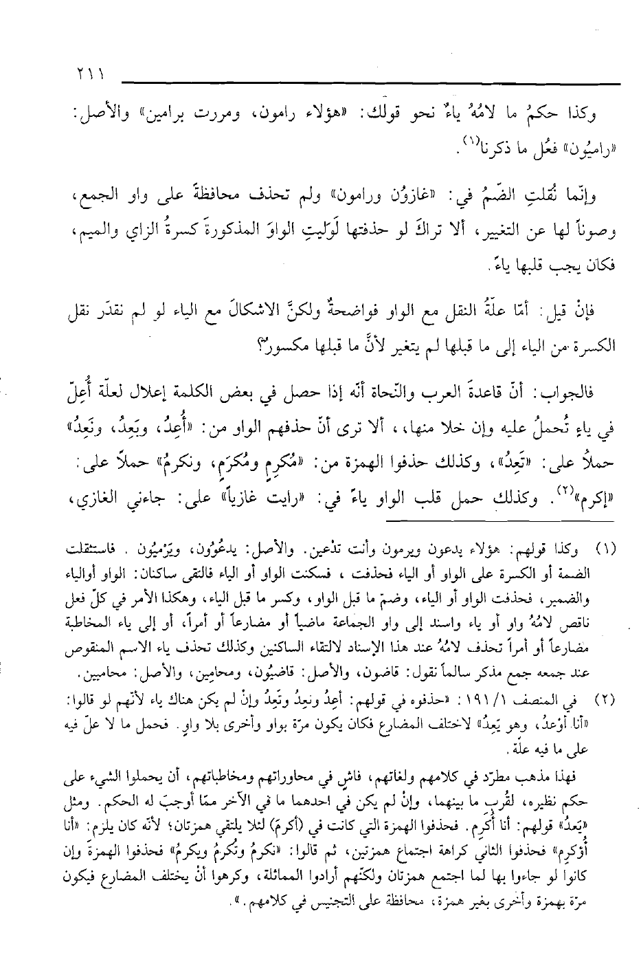 وإنما نقلت الضم في: "غازون ورامون" ولم تحذف محافظة على واو الجمع، وصناً لها عن التغيير، ألا تراك لو حذفتها لوليت الواو المذكورة كسرة الزاي والميم، فكان يجب قلبها ياءً.