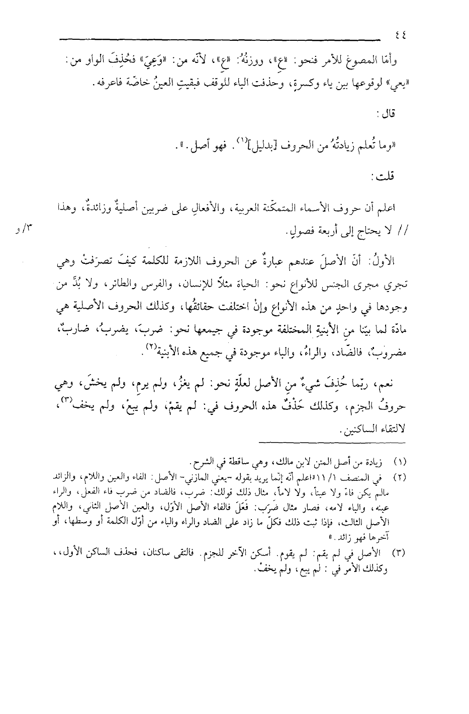 وأما المصوغ للأمر فنحو: "ع" ووزنه: "ع", لأنه من: "وَعِيَ" فحذف الواو من: "يعي" لوقوعها بين ياء وكسرة, وحذفت الياء للوقف فبقيت العين خاصة فاعرفه. قال: "وما تعلم زيادته من الحروف [بدليل]. فهو أصل." قلت: أعلم أن حروف الأسماء المتمكنة العربية, والأفعال على ضربين أصلية وزائدة, وهذا // لا يحتاج إلى أربعة فصول.