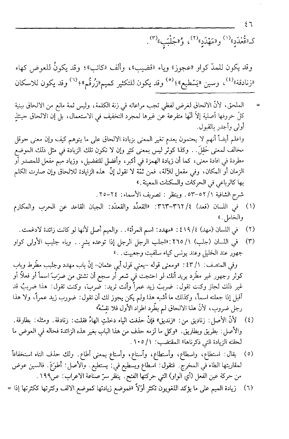 كـ "قُعْدَدِ" و"مَهْدَدِ", و"جَلْبَبِ". وقد يكون للمد كواو "عجوز" وياء "قضيب", وألف "كاتب"؛ وقد يكون للعوض كهاء "زنادقة", وسين "يسطيع"؛ وقد يكون للتكثير كميم "زرقم"؛ وقد يكون للإسكان
