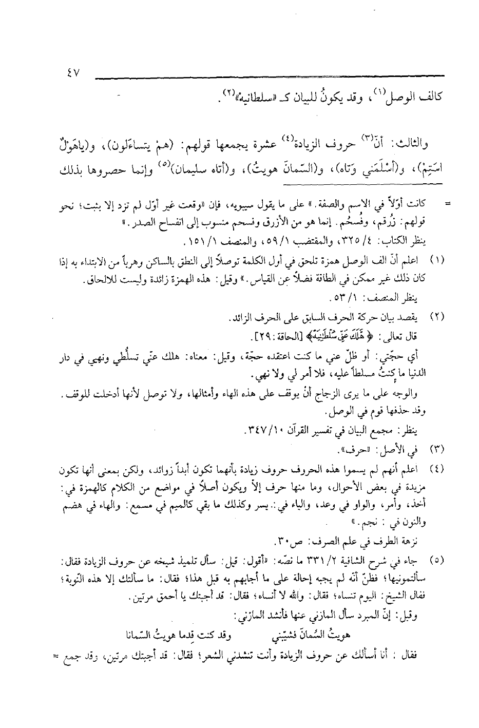 والثالث: أن حروف الزيادة عشرة يجمعها قولهم: (هم يتساءلون) , و (ياهول استم) , وأسلمني وتاه) , و (السمان هويت) , و (أتاه سليمان) وإنما حصروها بذلك