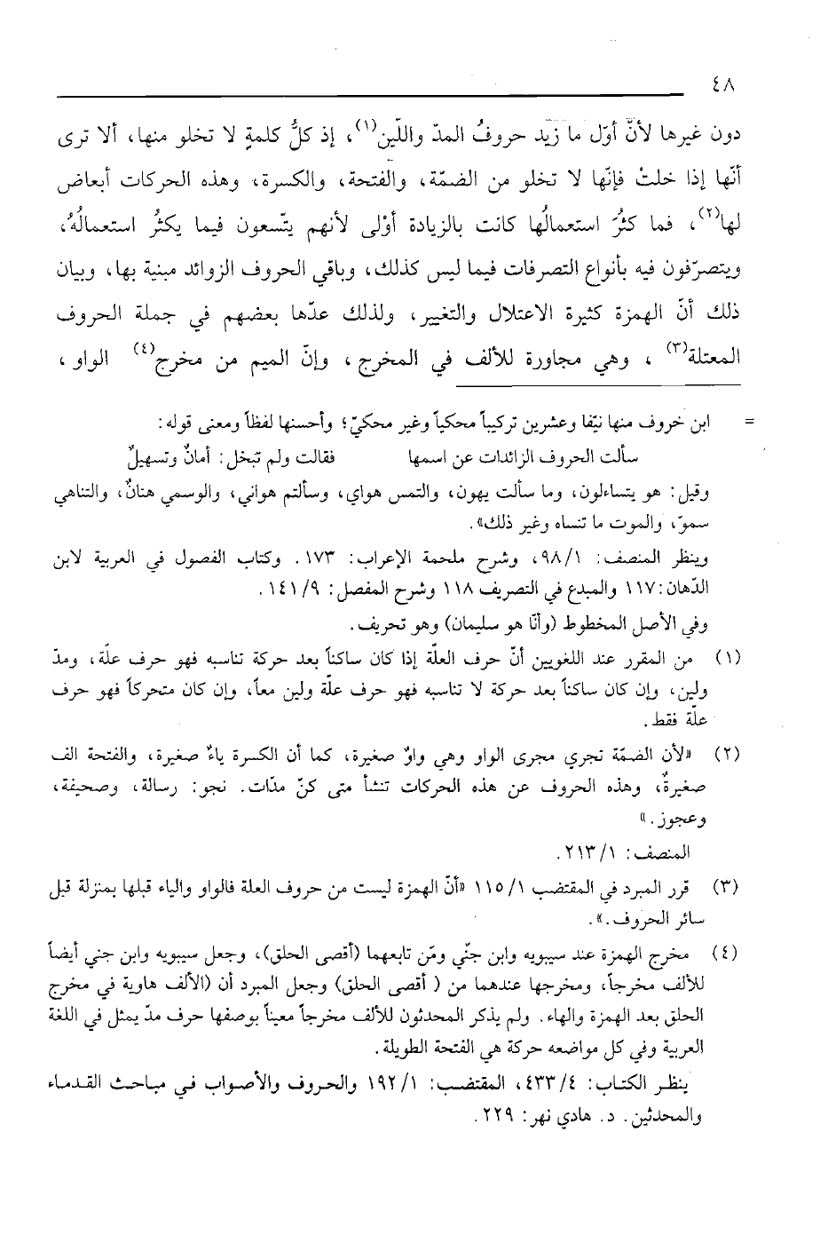 أنها إذا خلت فإنها لا تخلو من الضمة, والفتحة, والكسرة, وهذه الحركات أبعاض لها, فما كثر استعمالها كانت بالزيادة أولى لأنهم يتسعون فيما يكثر استعماله, ويتصرفون فيه بأنواع التصرفات فما ليس كذلك, وباقي الحروف الزوائد مبنية بها, وبيان ذلك أن الهمزة كثيرة الاعتلال والتغيير, ولذلك عدها بعضهم في جملة الحروف المعتلة, وهي مجاورة للألف في المخرج, وإن الميم من مخرج الواو,