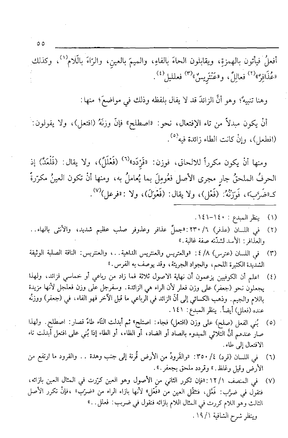 أفعل فيأتون بالهمزة, ويقابلون الحاء بالفاء, والميم بالعين, والراء باللام, وكذلك "عذافر" فعالل, و"عنتريس" فعلليل. وهنا تنبيه؛ وهو أن الزائد قد لا يقال بلفظه وذلك في مواضع؛ منها: أن يكون مبدلاً من تاء الافتعال, نحو: "اصطلح" فإن وزنه (افتعل) ,ولا يقولون: