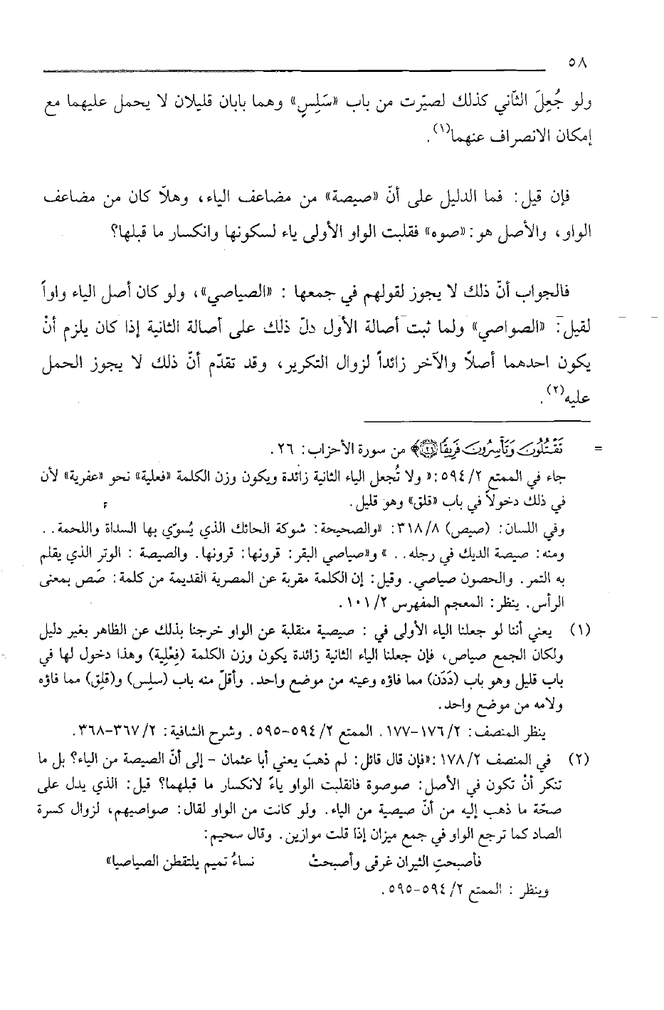 ولو جعل الثاني كذلك لصيرت من باب "سلس" وهما بابان قليلان لا يحمل عليهما مع إمكان الانصراف عنهما. فإن قيل: فما الدليل على أنه "صيصة" من مضاعف الياء, وهلا كان من مضاعف الواو, والأصل هو: "صوه" فقلبت الواو الأولى ياء لسكونها وانكسار ما قبلها؟ فالجواب أن ذلك لا يجوز لقولهم في جمعها: "الصياصي", ولو كان أصل الياء واواً لقيل: "الصواصي" ولما ثبت أصالة الأول دل ذلك على أصالة الثانية إذا كان يلزم أن يكون احدهما أصلاً والآخر زائداً لزوال التكرير, وقد تقدم أن ذلك لا يجوز الحمل عليه.