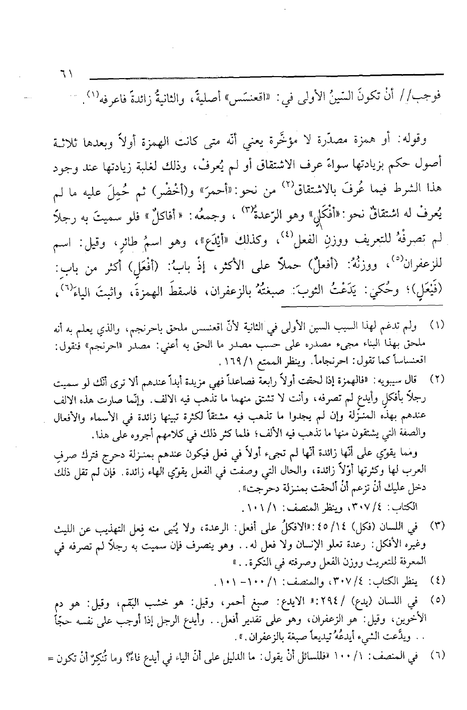 فوجب // أن تكون السين الأولى في: "اقعنسس" أصلية, والثانية زائدة فاعرفه. وقوله: أو همزة مصدرة لا مؤخرة يعني أنه متى كانت الهمزة أولاً وبعدها ثلاثة أصول حكم بزيادتها سواء عرف بالاشتقاق أو لم يعرف, وذلك لغلبة زيادتها عند وجود هذا الشرط فيما عرف بالاشتقاق من نحو: "أحمر" و (أخضر) ثم حمل عليه ما لم يعرف له اشتقاق نحو: "أفْكَلِ" وهو الرعدة, وجمعه: "أفاكل" فلو سميت به رجلاً لم تصرفه للتعريف ووزن الفعل, وكذلك "أيدع", وهو اسم طائر, وقيل: اسم