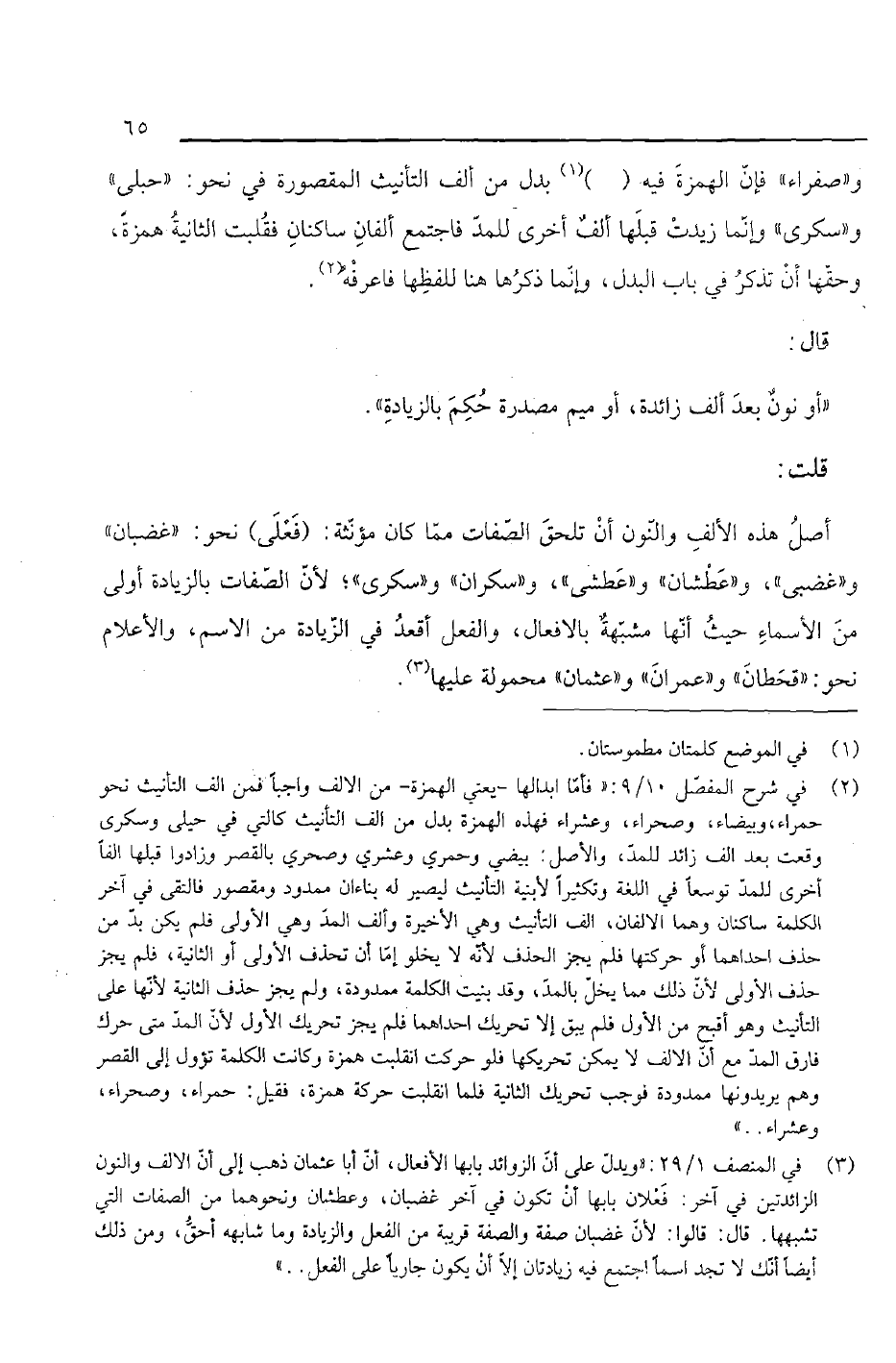 و"صفراء" فإن الهمزة فيه () بدل من ألف التأنيث المقصورة في نحو: "حبلى" و"سكرى" وإنما زيدت قبلها ألف أخرى للمد فاجتمع ألفان ساكنان فقلبت الثانية همزة, وحقها أن تذكر في باب البدل, وإنما ذكرها هنا للفظها فاعرفه. قال: "أو نون بعد ألف زائدة, أو ميم مصدرة حكم بالزيادة". قلت: أصل هذه الألف والنون أن تلحق الصفات مما كان مؤنثة: (فَعْلَى) نحو: "غضبان" و"غضبى", و"عطشان" و"عطشى", و"سكران", و"سكرى"؛ لأن الصفات بالزيادة أولى من الأسماء حيث أنها مشبهة بالأفعال, والفعل أقعد في الزيادة من الاسم, والأعلام نحو: "قحطان" "عمران" و"عثمان" محمولة عليها.