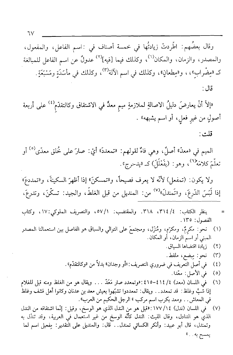وقال بعضهم: اطردت زيادتها في خمسة أصناف في: اسم الفاعل, والمفعول, والمصدر, والزمان, والمكان, وكذلك فيما [فيه] عدول عن اسم الفاعل للمبالغة كـ "مضراب", و"مطعان", وكذلك في اسم الآلة, وكذلك في مأسدة ومسبعة قال: "إلا أن يعارض دليل الأصالة لملازمة ميم معد في الاشتقاق وكالتقدم على أربعة أصول من غير فعل, أو اسم يشبهه". قلت: الميم في "معد" أصل, وهي فاء لقولهم: "تمعدد" أي: صار على خلق معدي أو تعلم كلامه, وهو: (يفَلَلَ) كـ "يدحرج". ولا يكون: (تمفعل) لأنه لا يعرف فصيحاً, و"تمسكن" إذا أظهر السكينة, و"تمددع" إذا لبس الدرع, و"تمندل" من: المنديل من قبل الغلط, والجيد: تسكن, وتدرع,