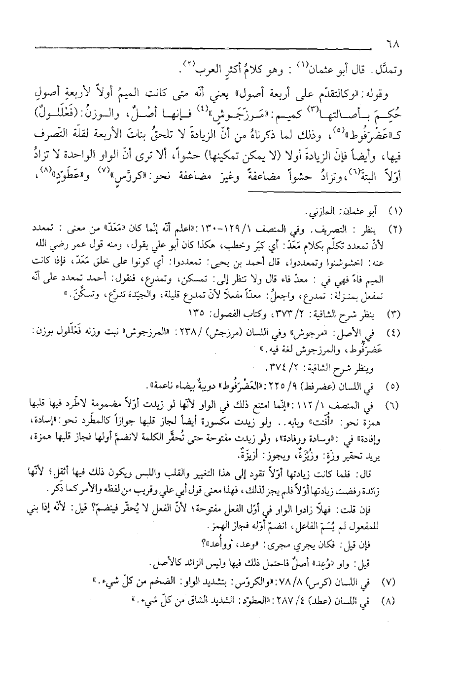 وتمدل. قال أبو عثمان: وهو كلام أكثر العرب. وقوله: "وكالتقدم على أربعة أصول" يعني أنه متى كانت الميم أولاً لأربعة أصول حكم بأصالتها كميم: "مرزجوش" فإنها أصل, والوزن: (فَعْلَلول) كـ " عضرفوط", وذلك لما ذكرناه من أن الزيادة لا تلحق بنات الأربعة لقلة التصرف فيها, وأيضاً فإن الزيادة أولاً (لا يمكن تمكينها) حشواً, ألا ترى أن الواو الواحدة لا تزداد أولاً البتة وتزداد حشواً مضاعفة وغير مضاعفة نحو: "كروس" و"عطود"