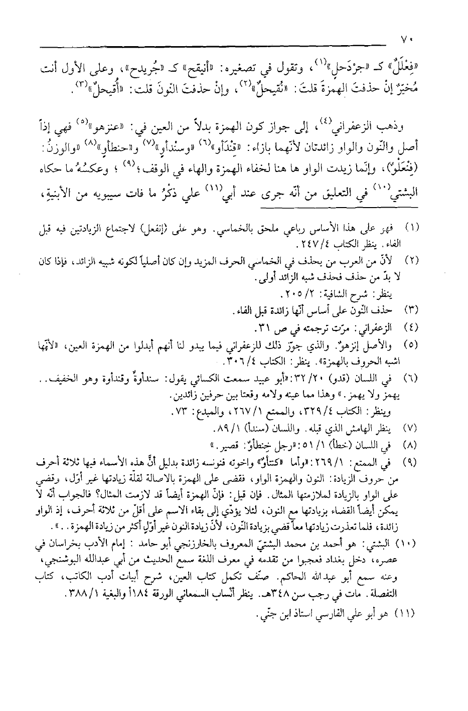 "فِعْلَل" كـ "جردحل", وتقول في تصغيره: "أنيقح" كـ "جريدح", وعلى الأول أنت مخير إن حذفت الهمزة قلت: "نقيحل", وإن حذفت النون قلت: "أقيحل". وذهب الزعفراني, إلى جواز كون الهمزة بدلاً من العين في: "عنزهو" فهي إذا أصل والنون والواو زائدتان لأنهما بازاء: "قندأو" وسندأو" و" حنطأو" "والوزن": (فنعلو) , وإنما زيدت الواو ها هنا لخفاء الهمزة والهاء في الوقف؛ وعكسه ما حكاه البشتي في التعليق من أنه جرى عند أبي على ذكر ما فات سيبويه من الأبنية,