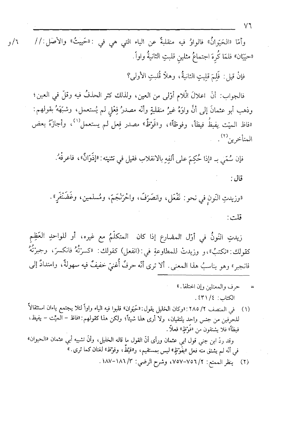 وأما "الحيوان" فالواو فيه منقلبة عن الياء التي هي في: "حييت" والأصل // "حييان" فلما كره اجتماع مثلين قلبت الثانية واواً. فإن قيل: فلم قلبت الثانية, وهلا قلبت الأولى؟ فالجواب: أن إعلال اللام أولى من العين, ولذلك كثر الحذف فيه وقل في العين؛ وذهب أبو عثمان إلى أن واوه غير منقلبة وأنه مصدر فعل لم يستعمل, وشبهه بقولهم: "فاظ الميت يفيظ فيظاً", و"فوظ" مصدر فعل لم يستعمل, وأجازه بعض المتأخرين. فإن سمي بـ "حكم على ألفه بالانقلاب فقيل في تثنيته: "إذوان", فاعرفه. قال: "وزيدت النون في نحو: نفعل, وانصرف, واحرنجم, ومسلمين, وغضنفر". قلت: زيدت النون في أول المضارع إذا كان المتكلم مع غيره, أو للواحد العظم كقولك: "نكتب", وزيدت للمطاوعة في: (انفعل) كقولك: "كسرته فانكسر, وجبرته فانجبر" وهو يناسب هذا المعنى. إلا ترى أنه حرف أغني خفيف فيه سهولة, وامتداد إلى