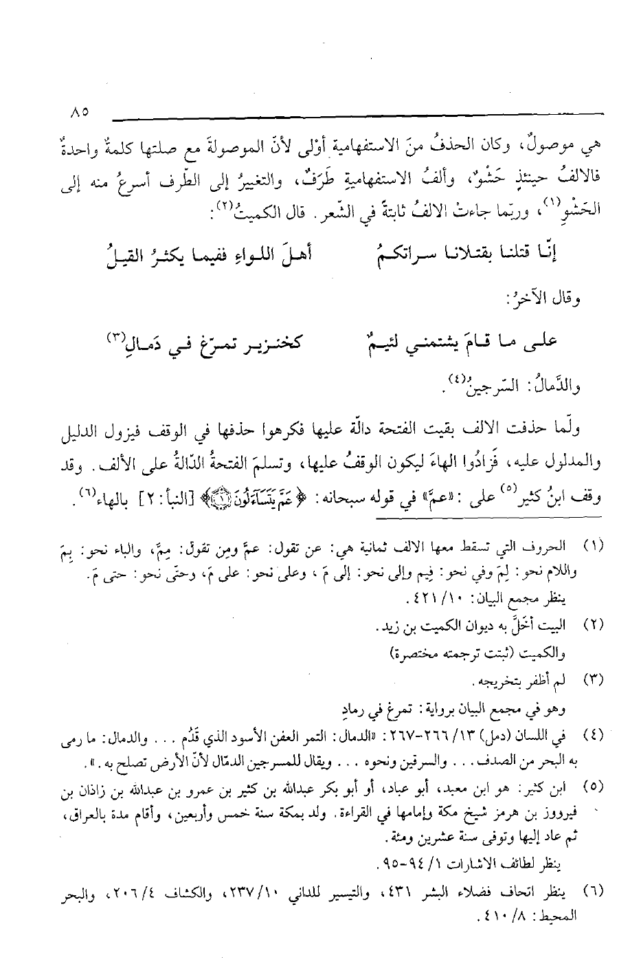ولما حذفت الألف بقيت الفتحة دالة عليها فكرهوا حذفها في الوقف فيزول الدليل والمدلول عليه، فزادوا الهاء ليكون الوقف عليها، وتسلم الفتحة الدالة على الألف. وقد وقف ابن كثير على: "عم" في قوله سبحانه: {عم يتساءلون} [النبأ: 2] بالهاء.