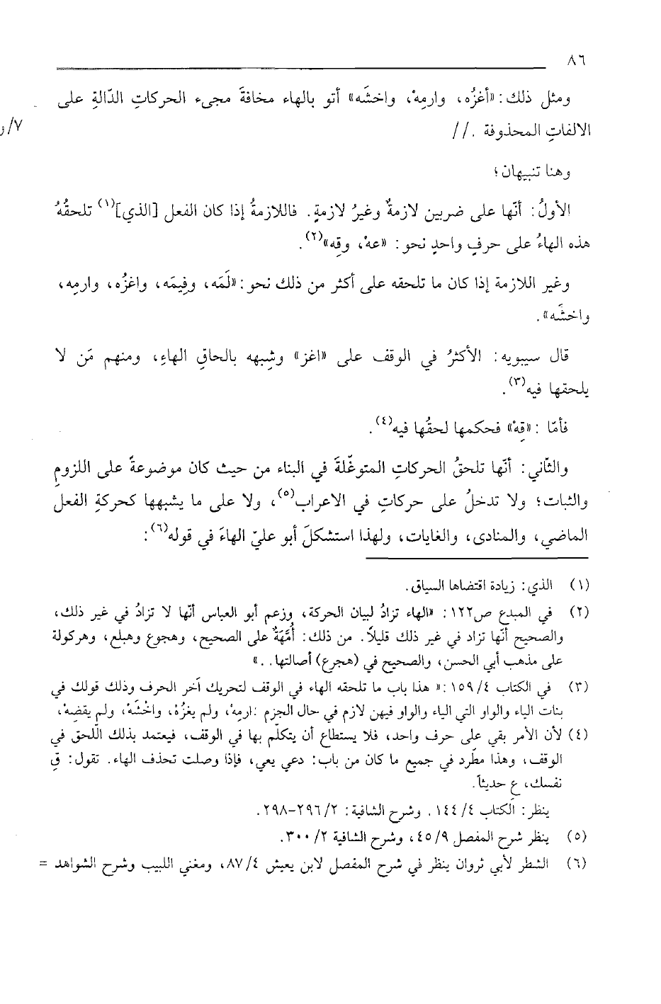 والثاني: أنها تلحق الحركات المتوغلة في البناء من حيث كان موضوعة على اللزوم والثبات، ولا تدخل على حركات في الإعراب، ولا على ما يشبهها كحركة الفعل الماضي، والمنادى، والغايات، ولهذا استشكل أبو علي الهاء في قوله: