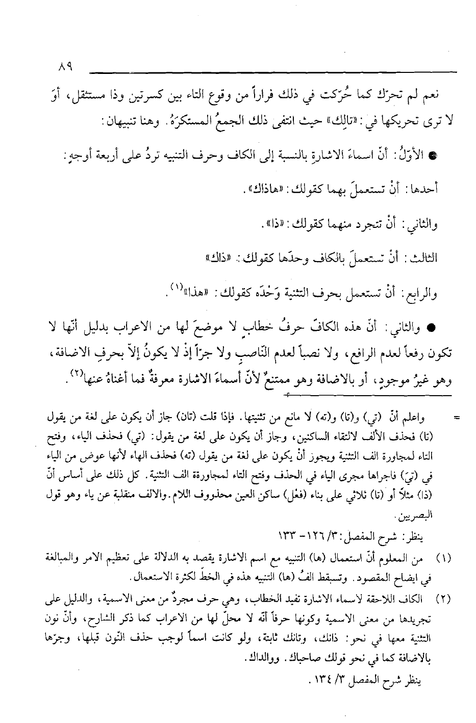 - والثاني: أن هذه الكاف حرف خطاب لا موضع لها من الإعراب بدليل أنها لا تكون رفعا لعدم الرافع، ولا نصبا لعدم الناصب ولا جراً إذ لا يكون إلا بحرف الإضافة، وهو غير موجود، أو بالإضافة وهو ممتنع لأن أسماء الإشارة معرفة فما أغناه عنها.