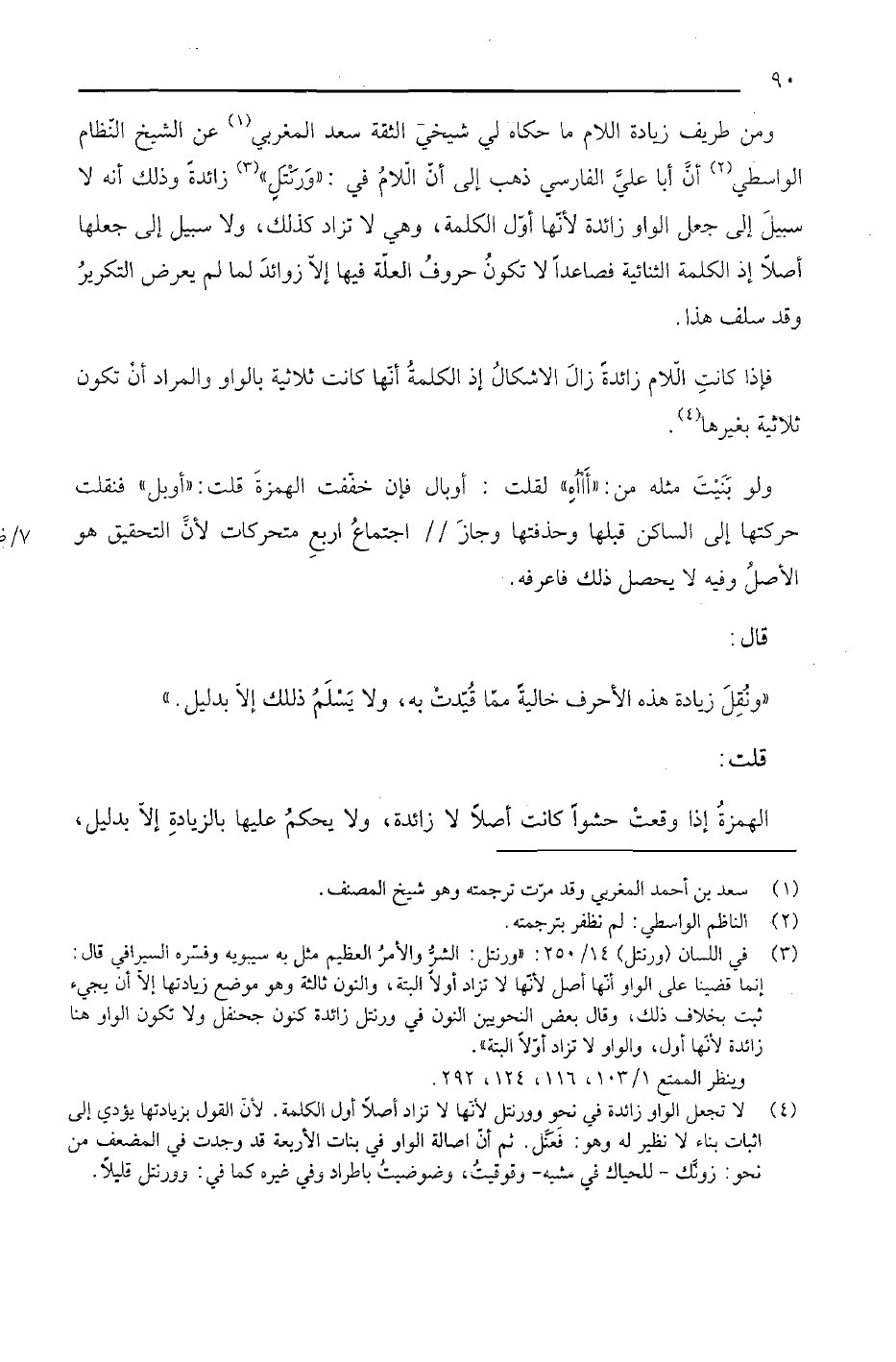 ومن طريف زيادة اللام ما حكاه لي شيخي الثقة سعد المغربي عن الشيخ النظام الواسطي أن أبا علي الفارسي ذهب إلى أن اللام في: "ورتتل" زائدة وذلك أنه لا سبيل إلى جعل الواو زائدة لأنها أول الكلمة، وهي لا تزاد كذلك، ولا سبيل إلى جعلها أصلا إذ الكلمة الثنائية فصاعداً لا تكون حروف العلة فيها إلا زوائد لما لم يعرض التكرير وقد سلف هذا.