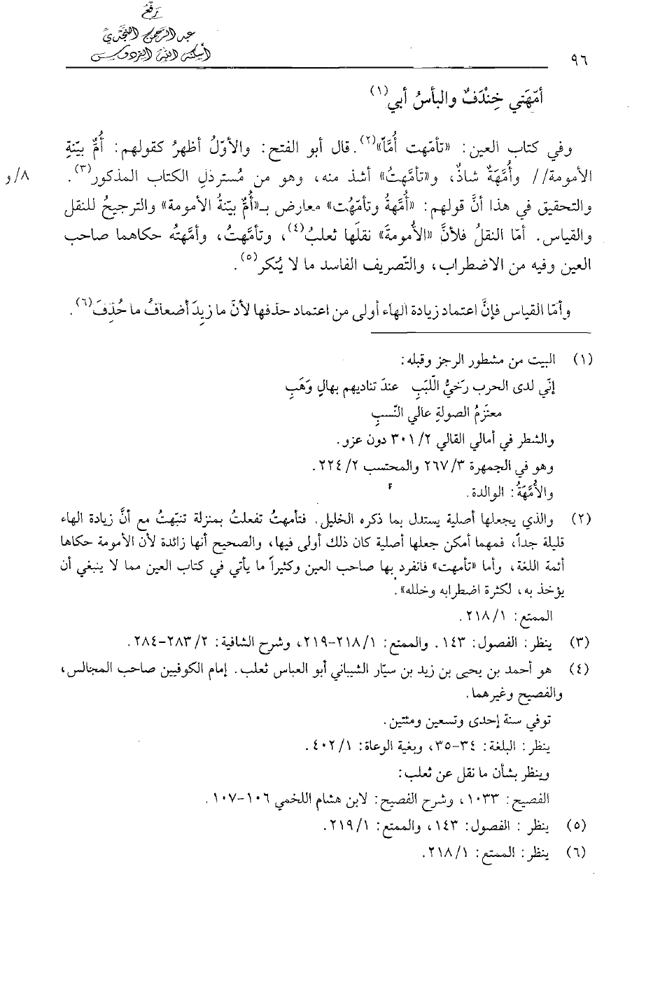 والتحقيق في هذا أن قولهم: "أمهة وتأمهت" معارض ب"أم بينة الأمومة" والرجيح للنقل والقياس. أما النقل فلأن "الأمومة" نقلها ثعلب، وتأمهت، وأمهته حكاهما صاحب العين وفيه من الاضطراب، والتصريف الفاسد ما لا ينكر.