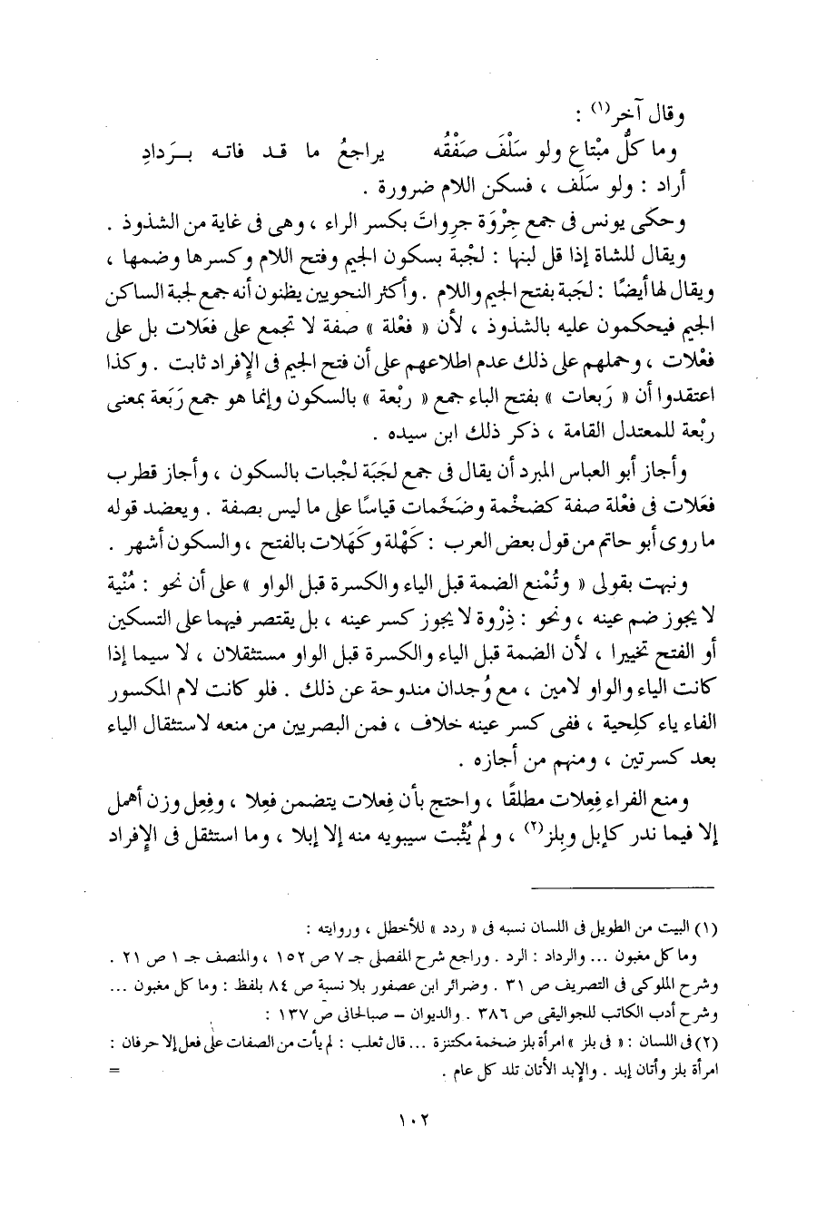 وأجاز أبو العباس المبرد أن يقال في جمع لجَبَة لجْبات بالسكون، وأجاز قطرب فَعَلات في فعْلة صفة كضخْمة وضخَمات قياسًا على ما ليس بصفة. ويعضد قوله ما روى أبو حاتم من قول بعض العرب: كَهْلة وكَهَلات بالفتح، والسكون أشهر.