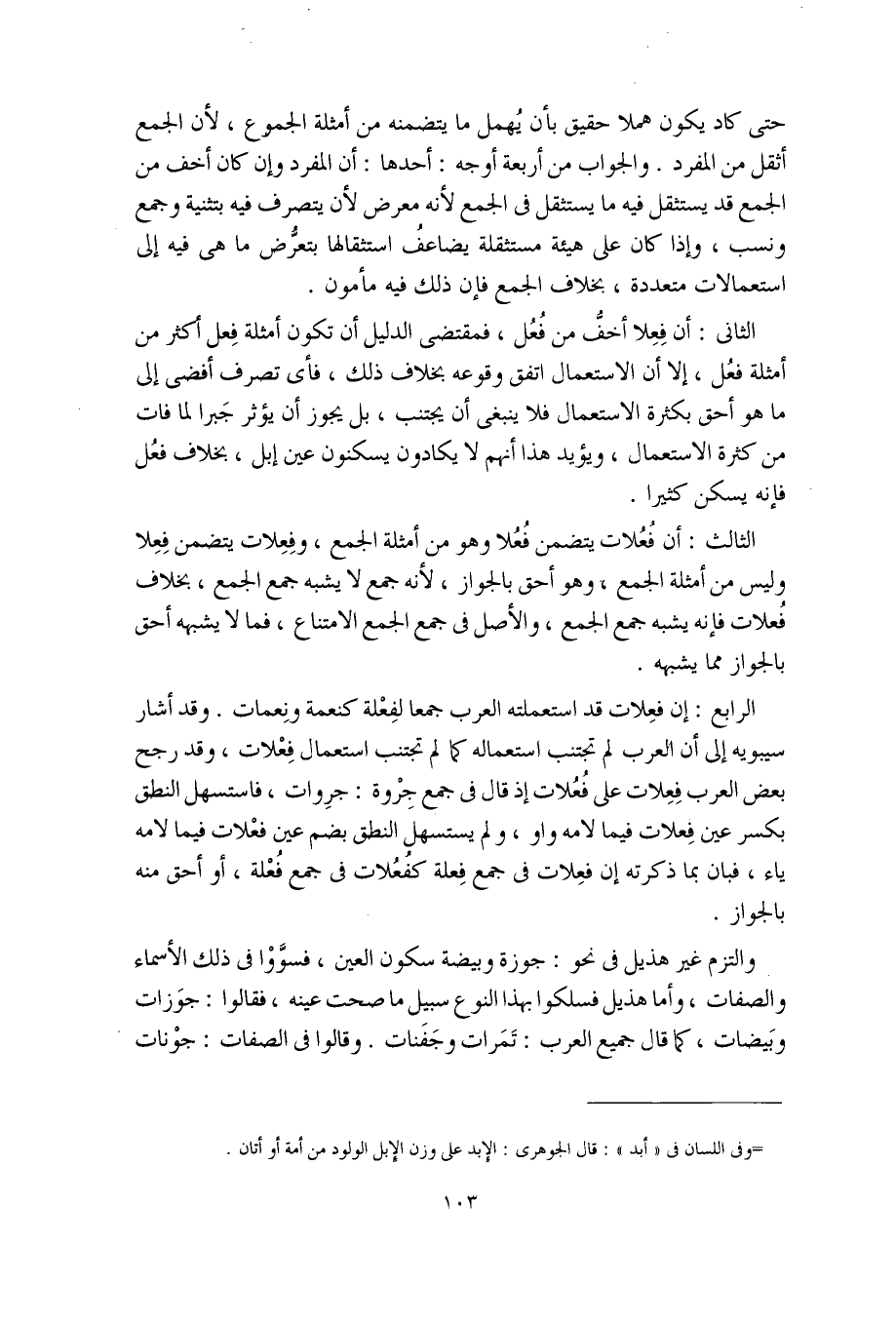 حتى كاد يكون هملا حقيق بأن يُهمل ما يتضمنه من أمثلة الجموع، لأن الجمع أثقل من المفرد. والجواب من أربعة أوجه: أحدها: أن المفرد وإن كان أخف من الجمع قد يستثقل فيه ما يستثقل في الجمع لأنه معرض لأن يتصرف فيه بتثنية وجمع ونسب، وإذا كان على هيئة مستثقلة يُضاعف استثقالها بتعرُّض ما هي فيه إلى استعمالات متعددة، بخلاف الجمع فإن ذلك فيه مأمون.
