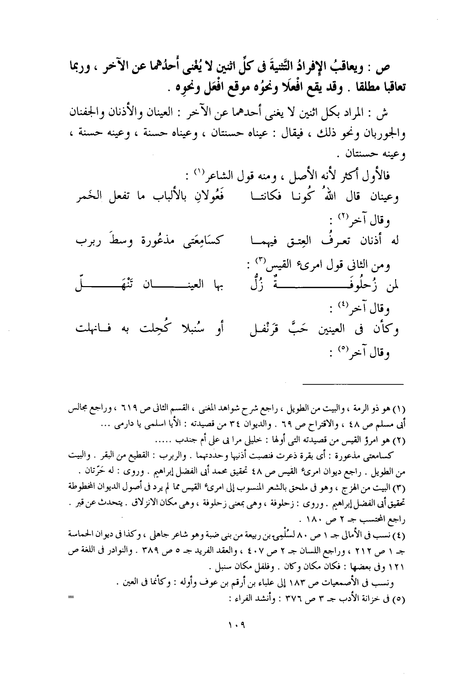 ش: المراد بكل اثنين لا يغني أحدهما عن الآخر: العينان والأذنان والجفنان والجوربان ونحو ذلك، فيقال: عيناه حسنتان، وعيناه حسنة، وعينه حسنة، وعينه حسنتان.