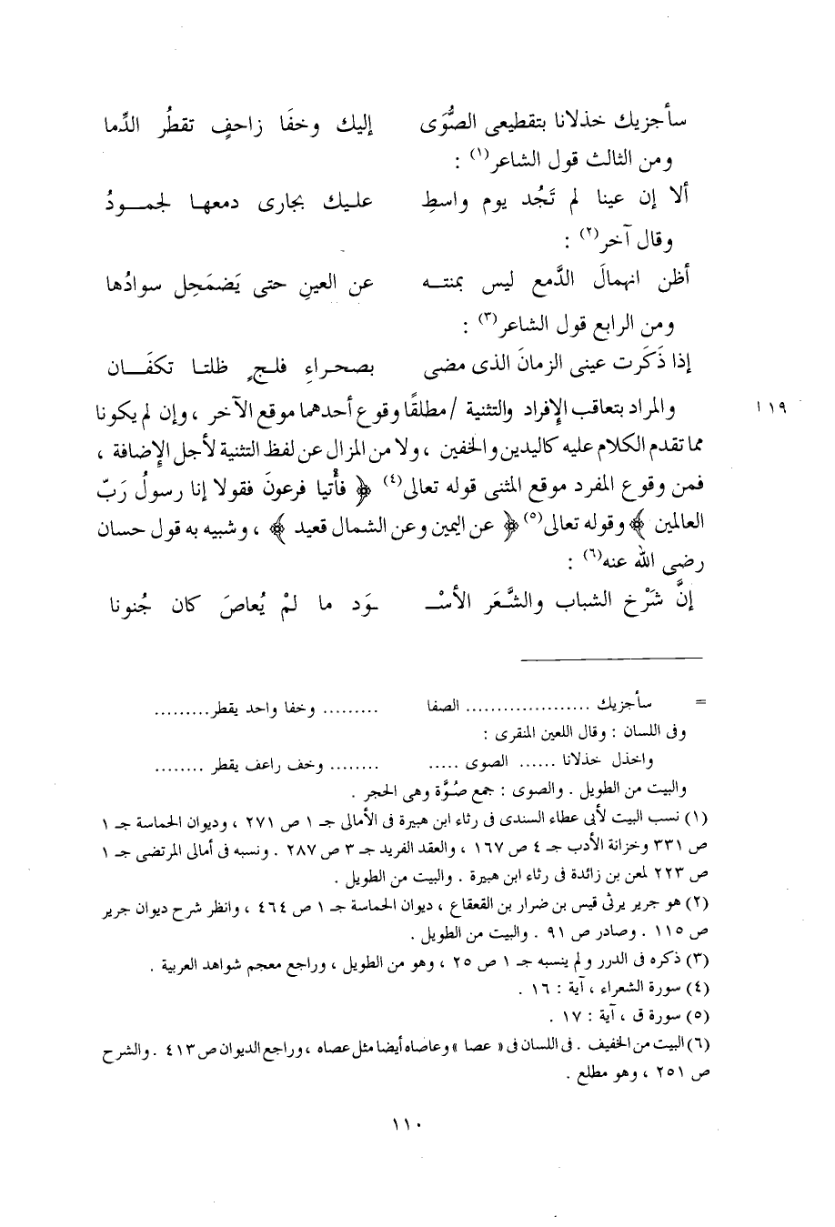 والمراد بتعاقب الإفراد والتثنية مطلقًا وقوع أحدهما موقع الآخر، وإن لم يكونا مما تقدم الكلام عليه كاليدين والخفين، ولا من المزال عن لفظ التثنية لأجل الإضافة، فمن وقوع المفرد موقع المثنى قوله تعالى (فاتيا فرعونَ فقولا إنا رسولُ ربّ العالمين) وقوله تعالى (عن اليمين وعن الشمال قعيد)، وشبيه به قول حسان رضي الله عنه: