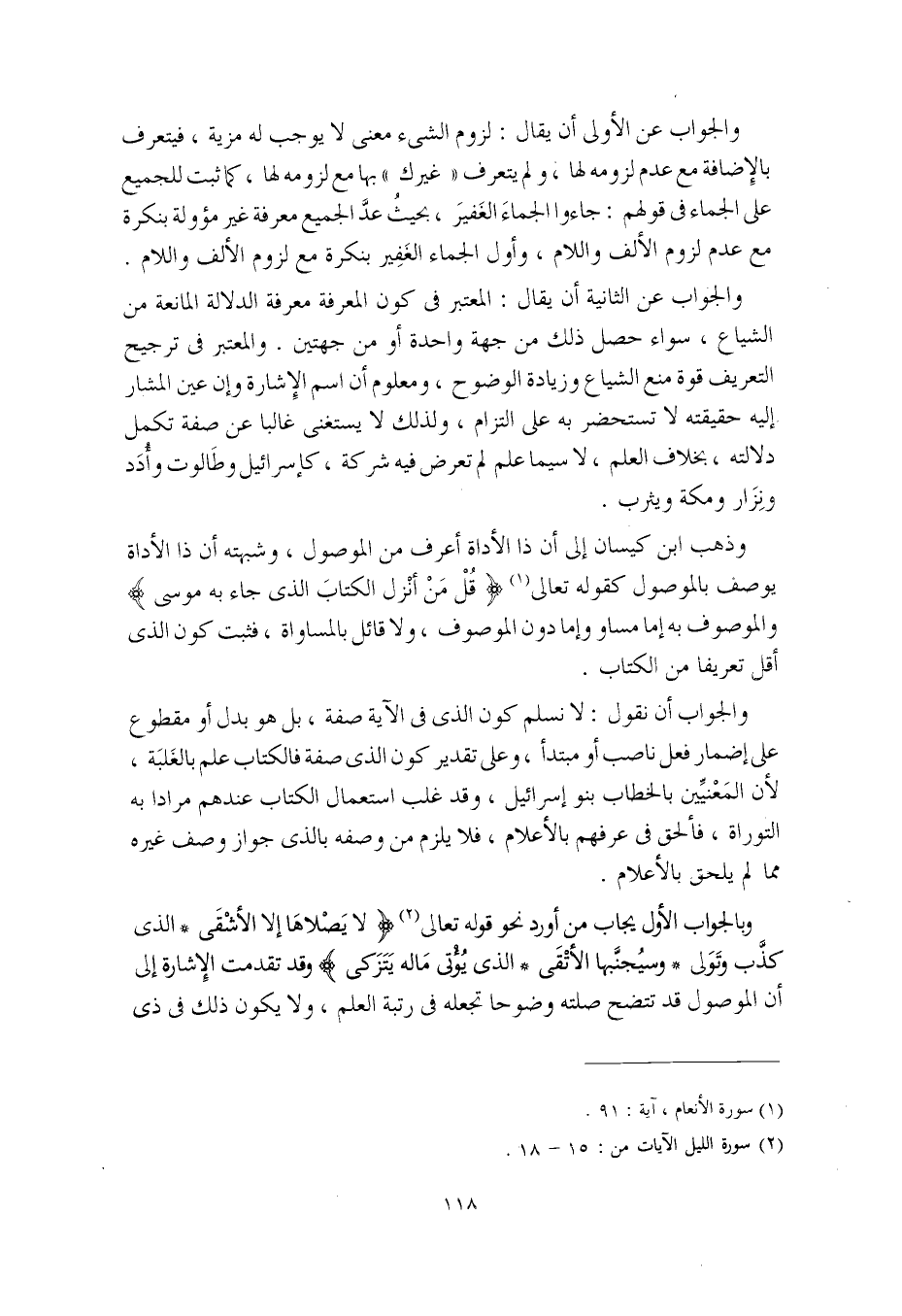وبالجواب الأول يجاب من أورد نحو قوله تعالى (لا يصْلاها إلا الأشقى* الذي كذَّب وتولى* وسيُجنَّبها الأتقى* الذي يُؤتي ماله يتزكى) وقد تقدمت الإشارة إلى أن الموصول قد تتضح صلته وضوحا تجعله في رتبة العلم، ولا يكون ذلك في ذي
