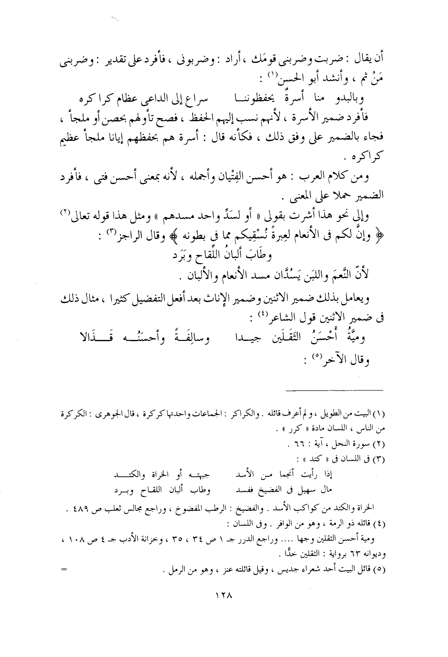 وإلى نحو هذا أشرت بقولي "أو لسَدِّ واحد مسدهم" ومثل هذا قوله تعالى (وإنَّ لكم في الأنعام لعِبرةً نُسْقِيكم مما في بطونه) وقال الراجز:
