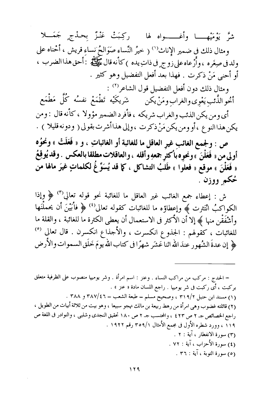 ش: إعطاء جمع الغائب غير العاقل ما للغائبة نحو قوله تعالى (وإذا الكواكبُ انْتَثرت) وإعطاؤه ما للغائبات كقوله تعالى (فأبَيْنَ أن يحملْنَها وأشْفَقْن منها) إلا أن الأكثر في الاستعمال أن يعطى الكثرة ما للغائبة، والقلة ما للغائبات، كقولهم: الجذوع انكسرت، والأجذاع انكسرن. قال تعالى: (إن عدة الشهور عند الله اثنا عشرَ شهرًا في كتاب الله يومَ خَلق السموات والأرض