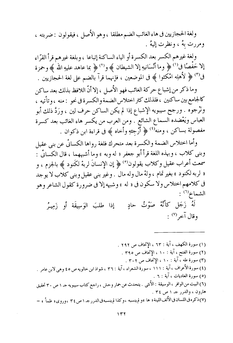 ولغة غيرهم الكسر بعد الكسرة أو الياء الساكنة إتباعا، وبلغة غيرهم قرأ القرّاء إلا حَفْصًا في (وما أنْسانِيهِ إلا الشيطان) و (بما عاهد عليهِ الله) وحمزة في (لأهلِه امْكثوا) في الموضعين، فإنهما قرآن بالضم على لغة الحجازيين.