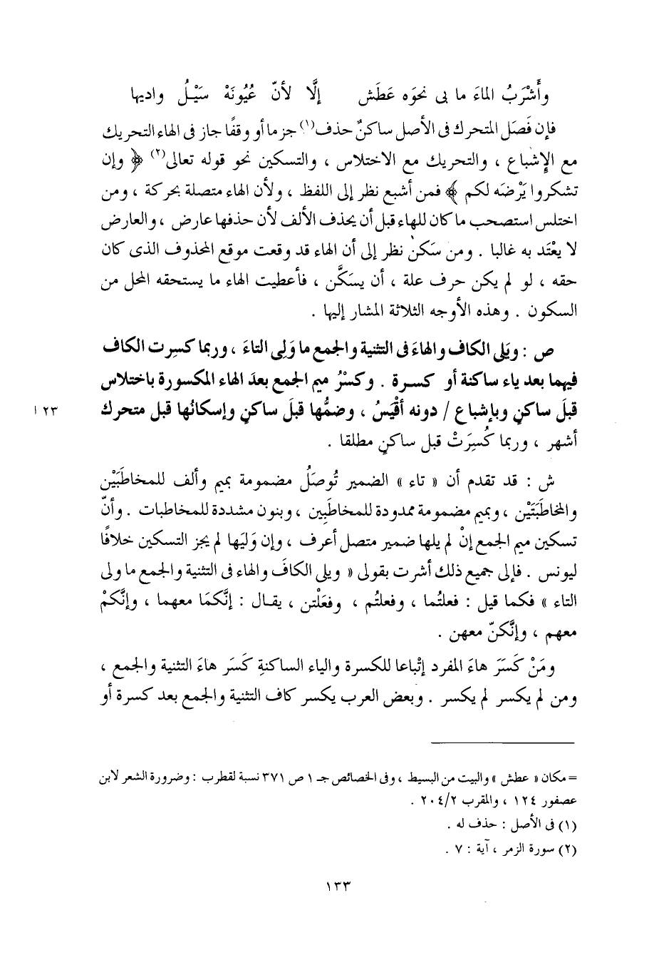 ش: قد تقدم أن "تاء" الضمير تُوصَلُ مضمومة بميم وألف للمخاطَبَيْن والمخاطَبَتَيْن، وبميم مضمومة ممدودة للمخاطَبِين، وبنون مشددة للمخاطبات. وأنّ تسكين ميم الجمع إنْ لم يلها ضمير متصل أعرف، وإن وَليَها لم يجز التسكين خلافًا ليونس. فإلى جميع ذلك أشرت بقولي "ويلي الكافَ والهاء في التثنية والجمع ما ولى التاء" فكما قيل: فعلتُما، وفعلتُم، وفَعلْتن، يقال: إنّكما معهما، وإنّكم معهم، وإنَّكنّ معهن.