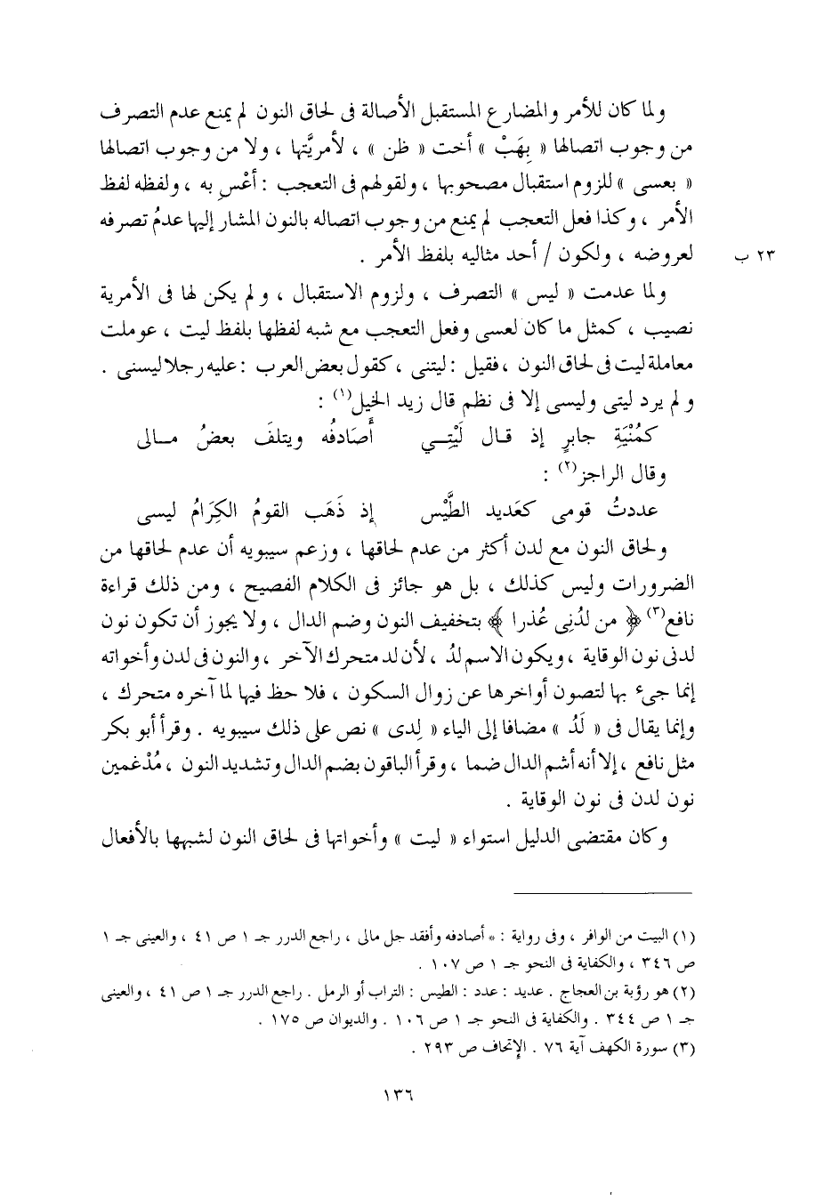 ولما عدمت "ليس" التصرف، ولزوم الاستقبال، ولم يكن لها في الأمرية نصيب، كمثل ما كان لعسى وفعل التعجب مع شبه لفظها بلفظ ليت، عوملت معاملة ليت في لحاق النون، فقيل: ليتني، كقول بعض العرب: عليه رجلا ليسنى. ولم يرد ليتي وليسي إلا في نظم قال زيد الخيل: