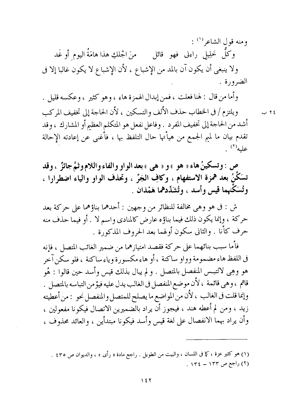 ص: وتسكينُ هاء "هو" و"هي" بعد الواو والفاء والام وثمَّ جائزٌ، وقد تسَكَّنُ بعد همزة الاستفهام، وكافِ الجَرِّ، وتحذف الواو والياء اضطرارا، وتُسَكِنهما قيس وأسد، وتُشَدِّدهما هَمْدان.